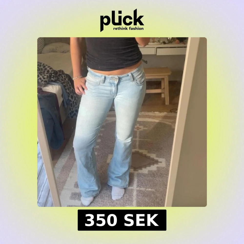 Säljer ett par ljusblå Levi's Superlow Flare jeans i klassisk denim. De har låg midja och utsvängda ben, perfekt för dig som gillar retrovibbar. Jeansen har fem fickor och Levi's ikoniska läderpatch bak. Riktigt snygga till sneakers eller boots. Har gått sönder lite precis vid midjan men inget man tänker på (se sista bild)❤️
