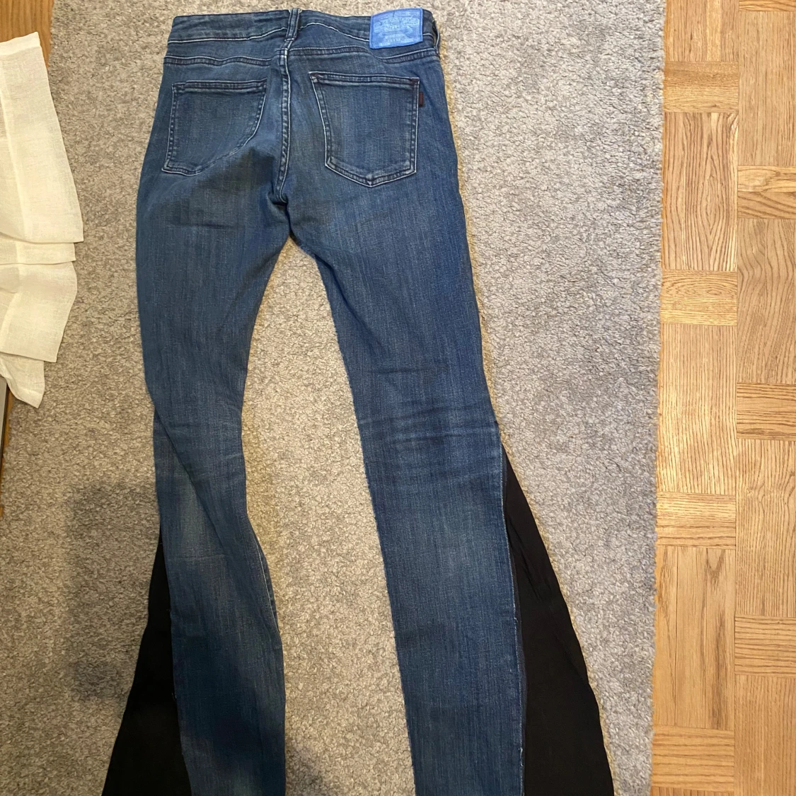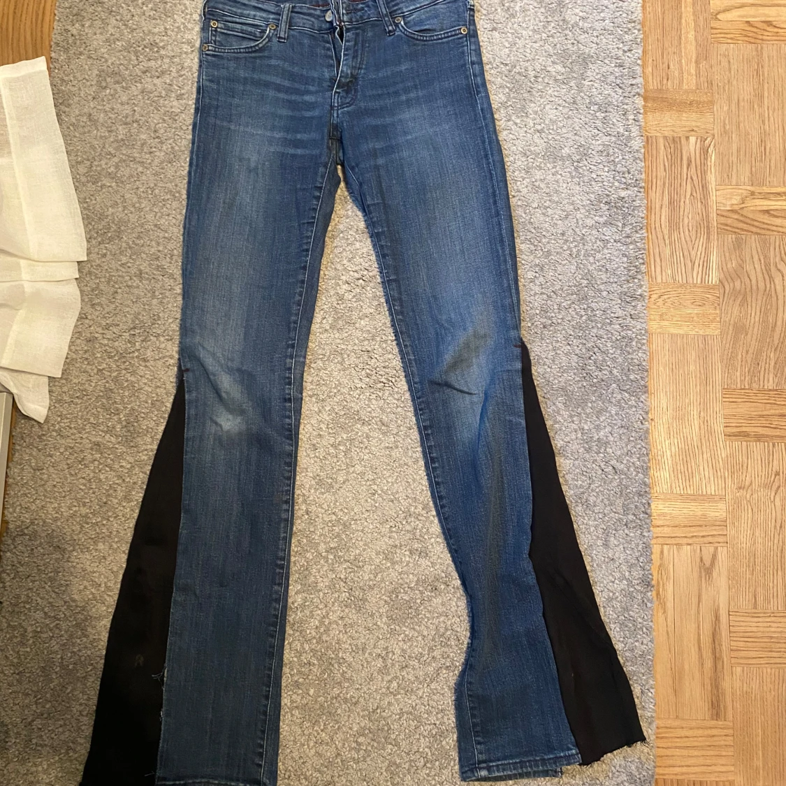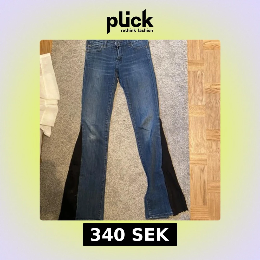 Blå jeans med bootcut passform och svarta tygslitsar längs bensidorna. Klassisk femficksmodell med medelhög midja och dragkedjegylf. Jeansen har en snygg tvätt och är tillverkade i jeansmaterial.