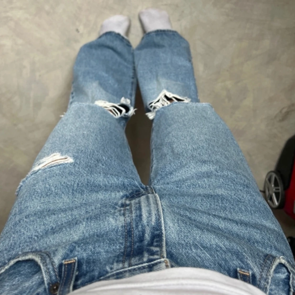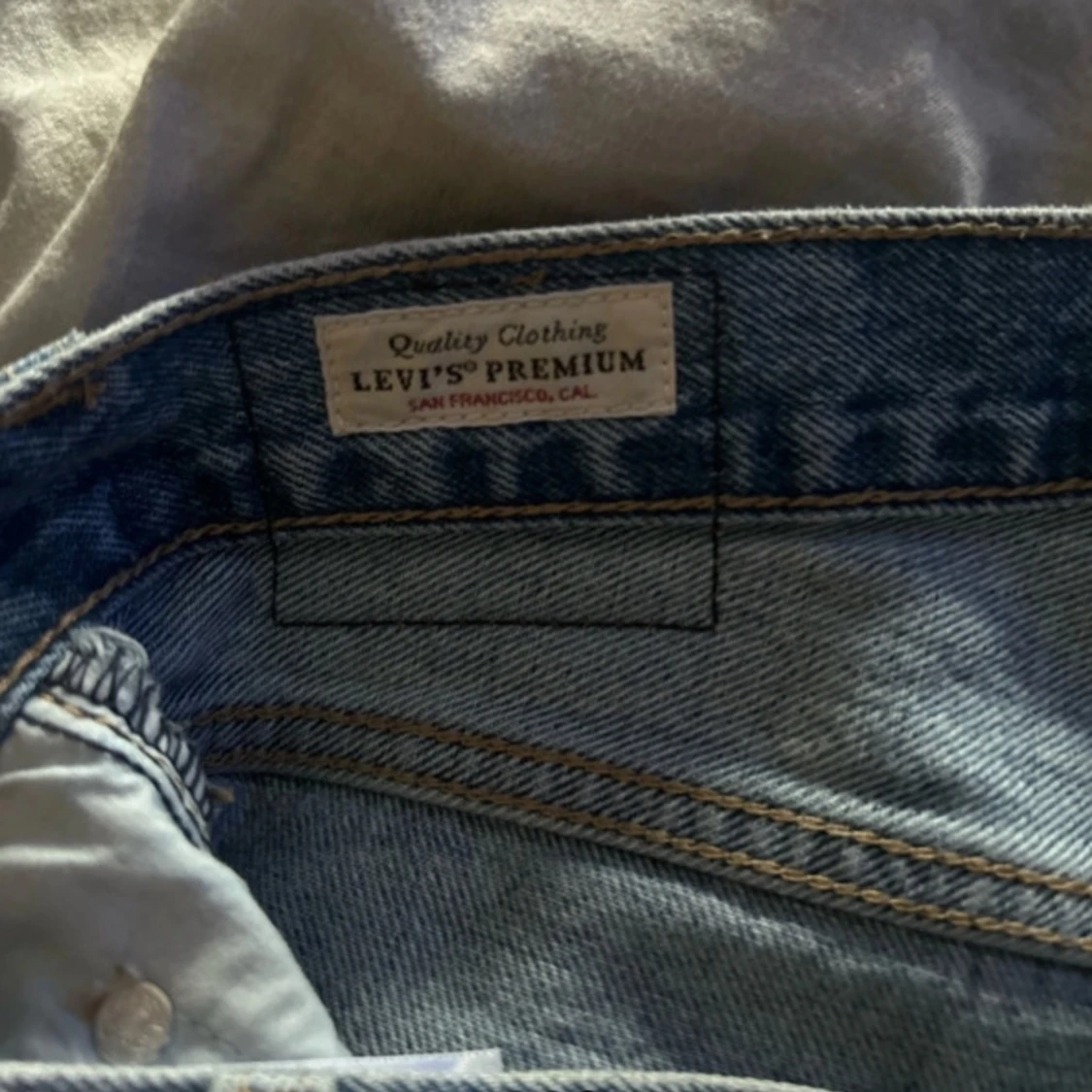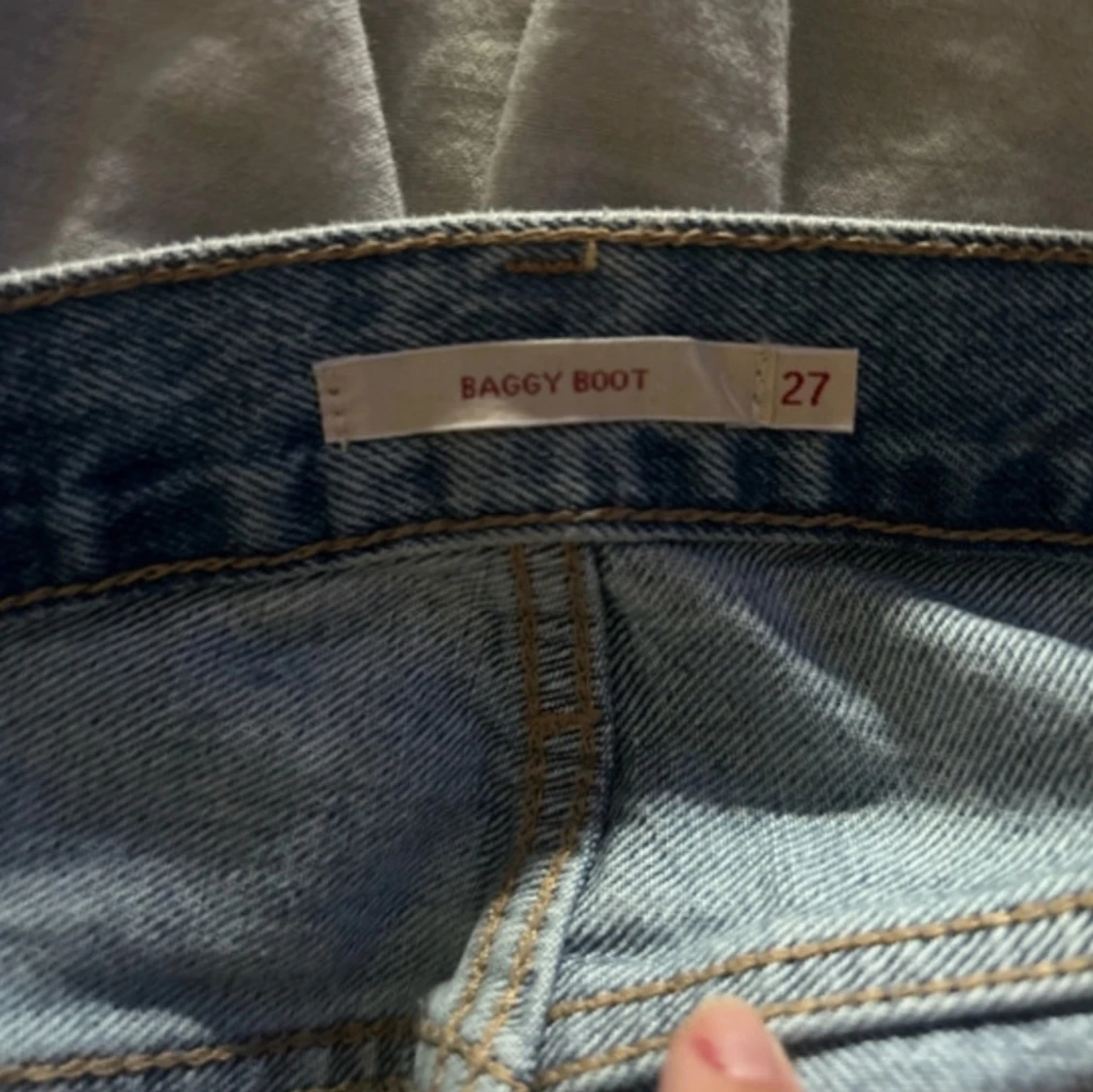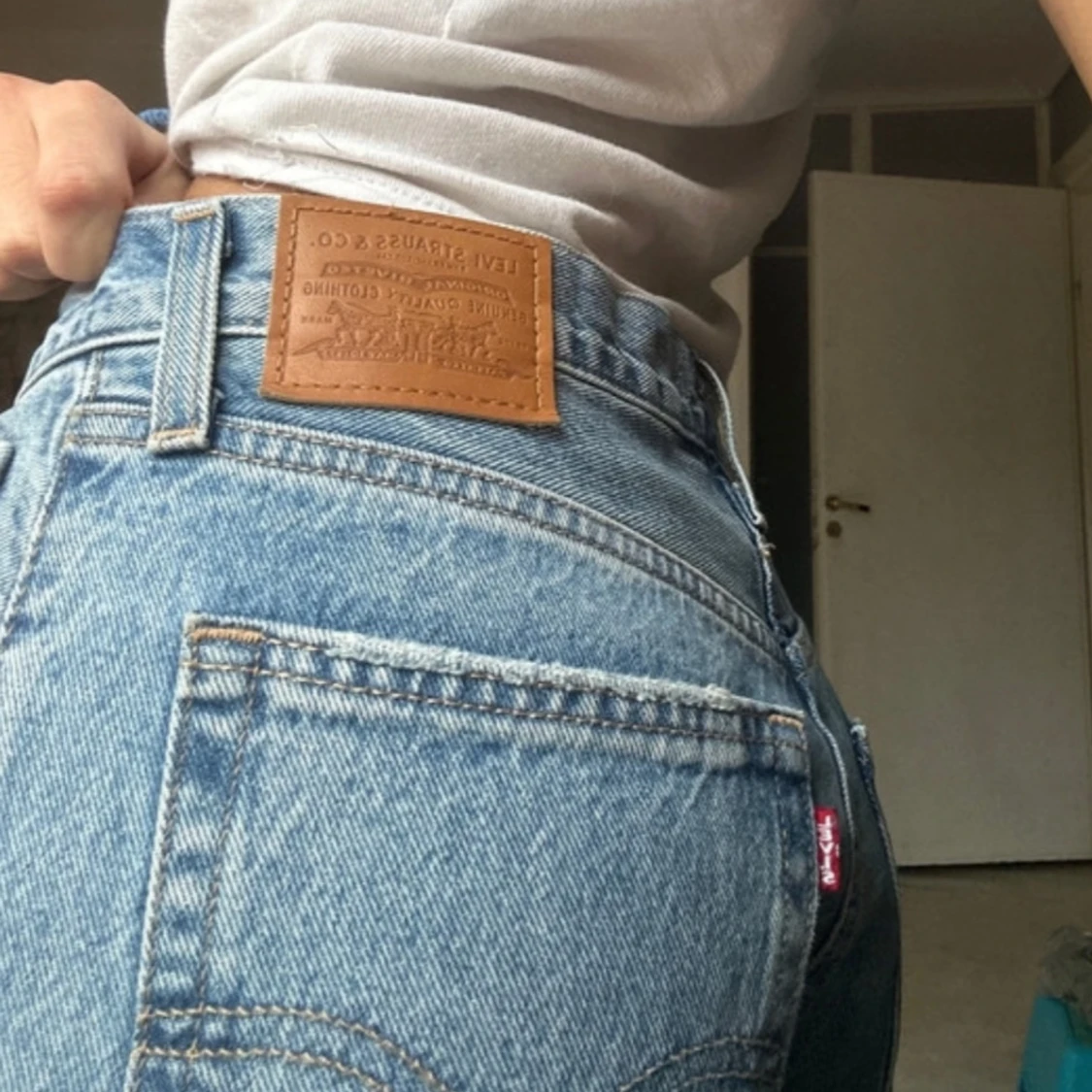 Säljer ett par snygga blå baggy jeans från Levi's. De har en avslappnad passform med slitna detaljer på knäna och en klassisk femficksdesign. Perfekta för en cool och avslappnad stil. Använt dom fåtal gånger! Lite stor runt midjan för mig.