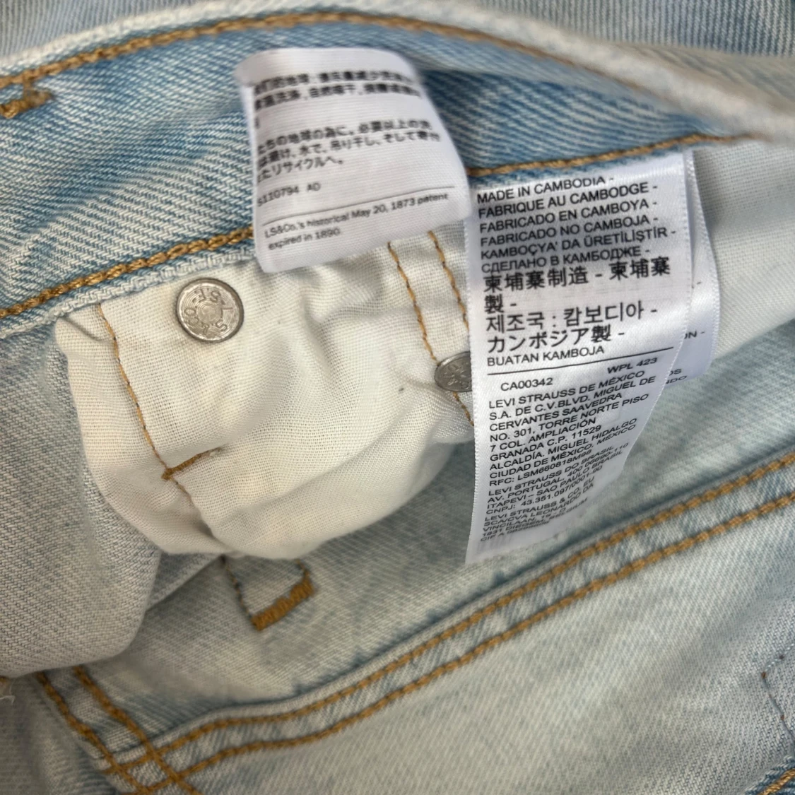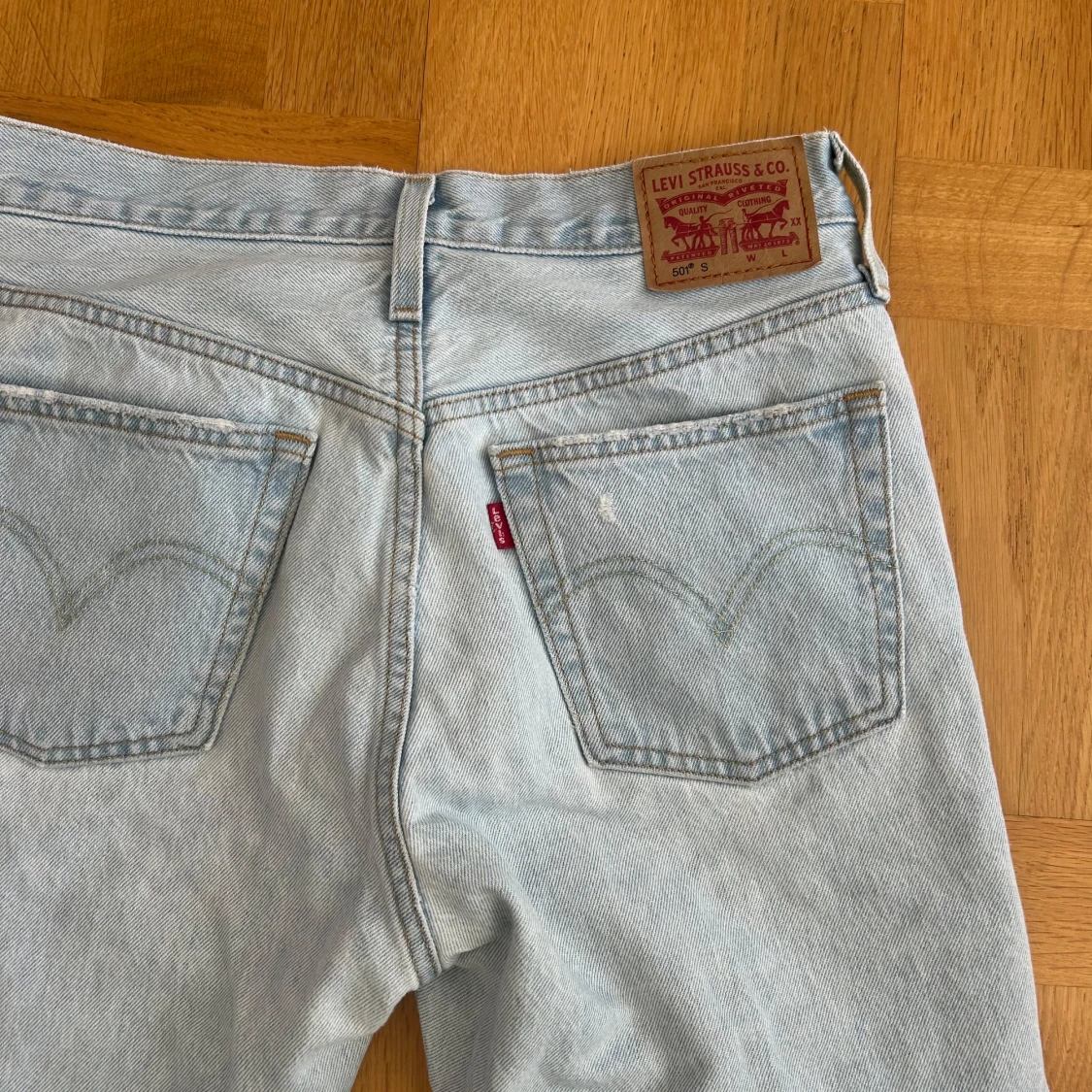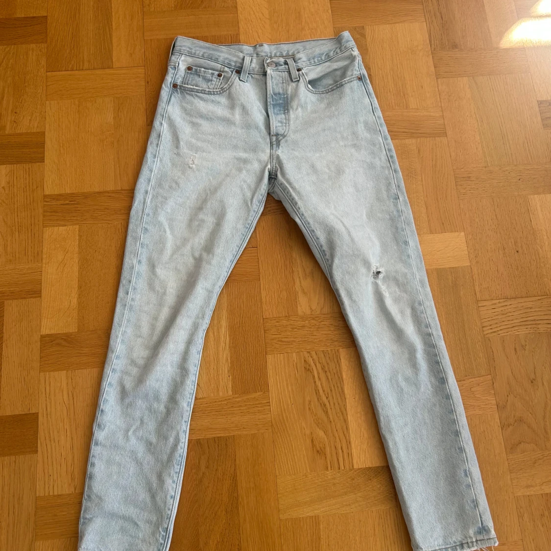 Snygga ljusblå 501 jeans från Levi's med klassisk femficksdesign och knappgylf. Perfekta för en avslappnad stil. Märkeslappen i brunt läder sitter baktill i midjan.