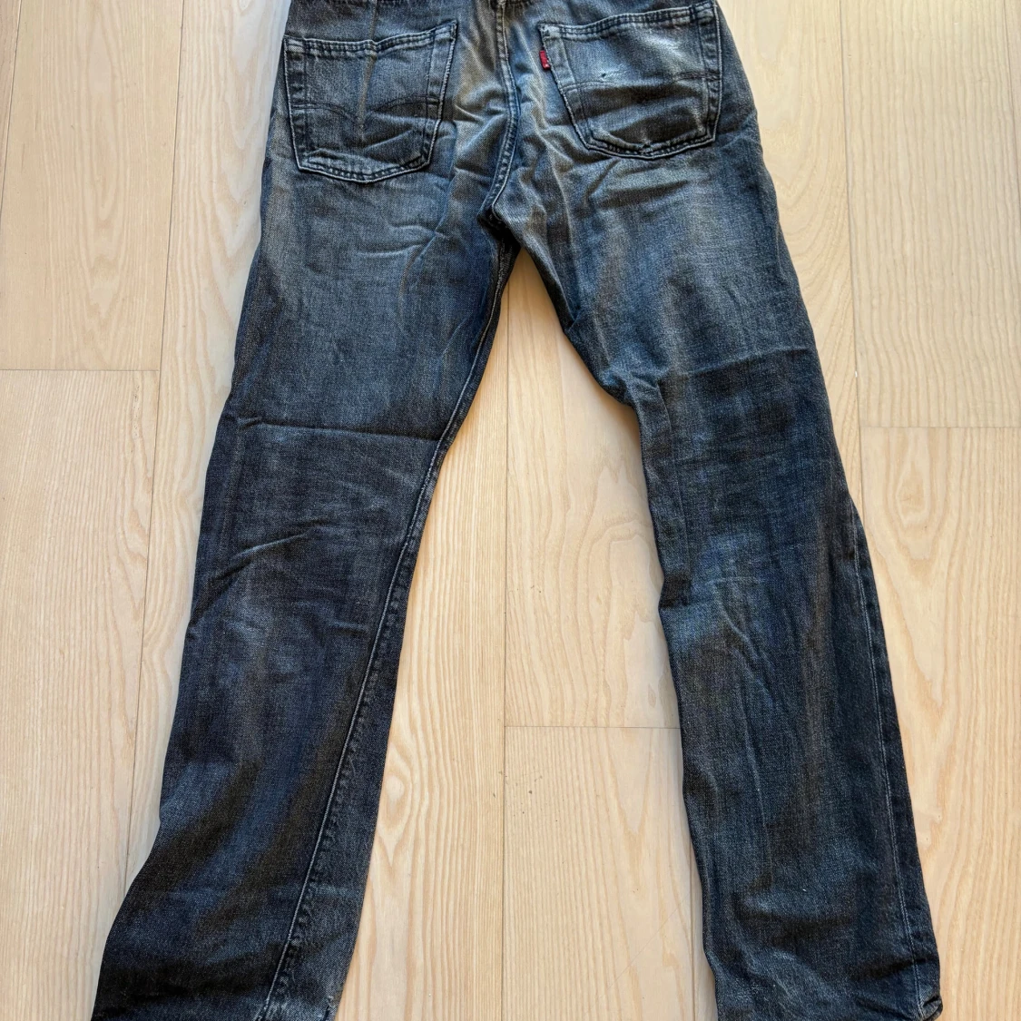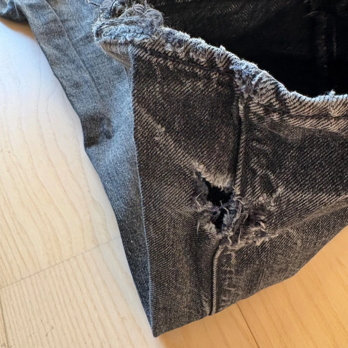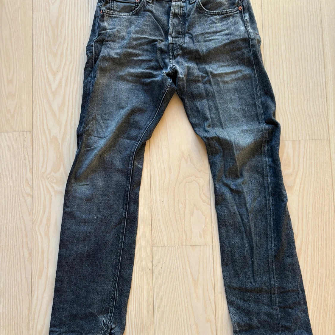 Klassiska Levi's 501 jeans i svart med slitningar och hål vid benslutet och skrevet. Rak passform och normal midja.