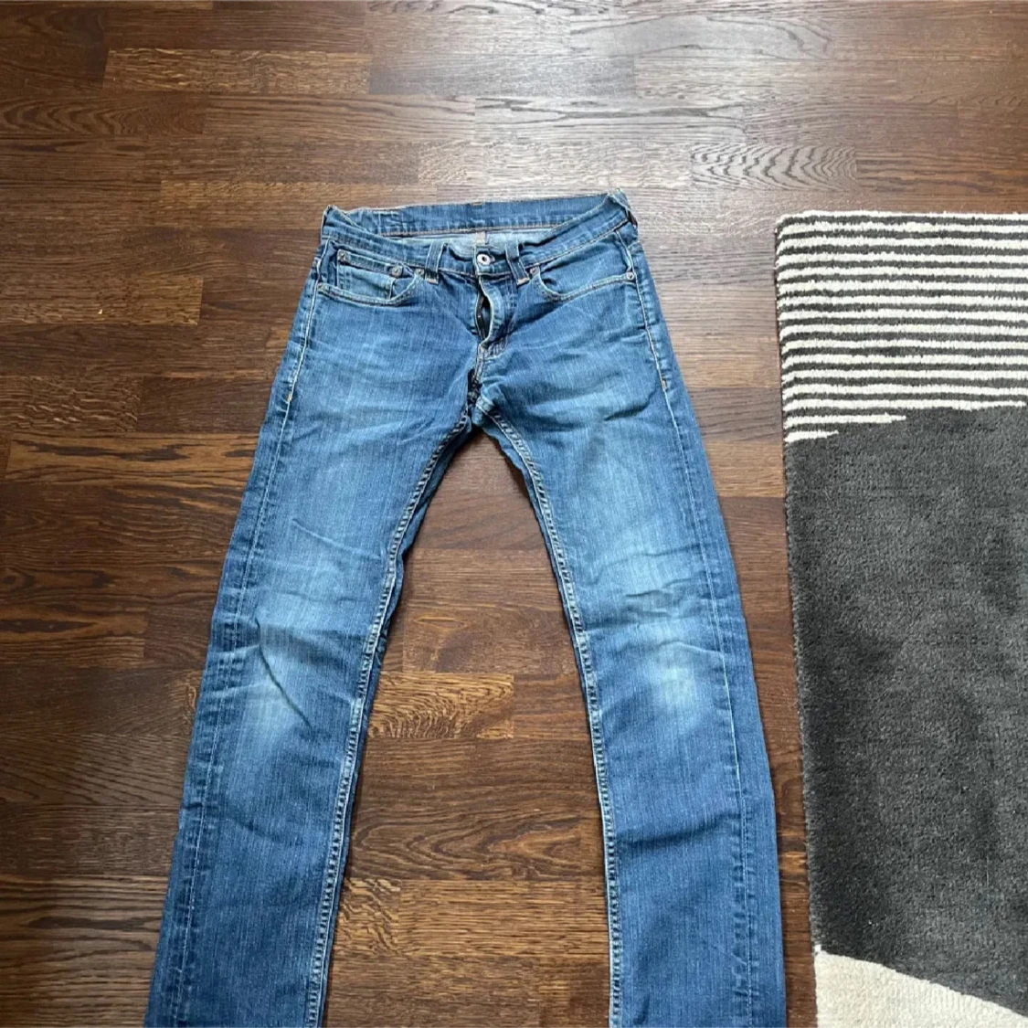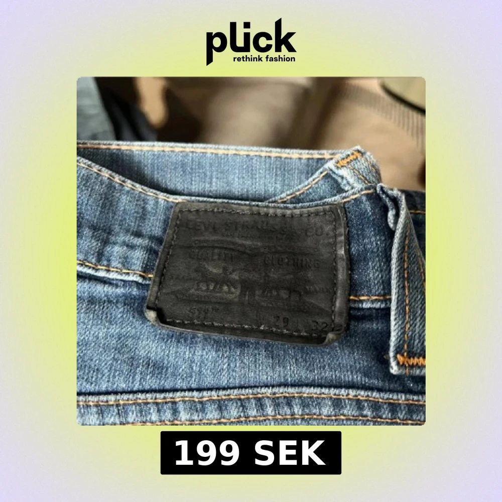 Säljer ett par klassiska Levi's 511 jeans i blå denim med snygg slitning och orange sömmar. Modellen har normal passform och raka ben, med fem fickor och svart läderpatch bak i midjan. Perfekta för dig som gillar en tidlös jeanslook.