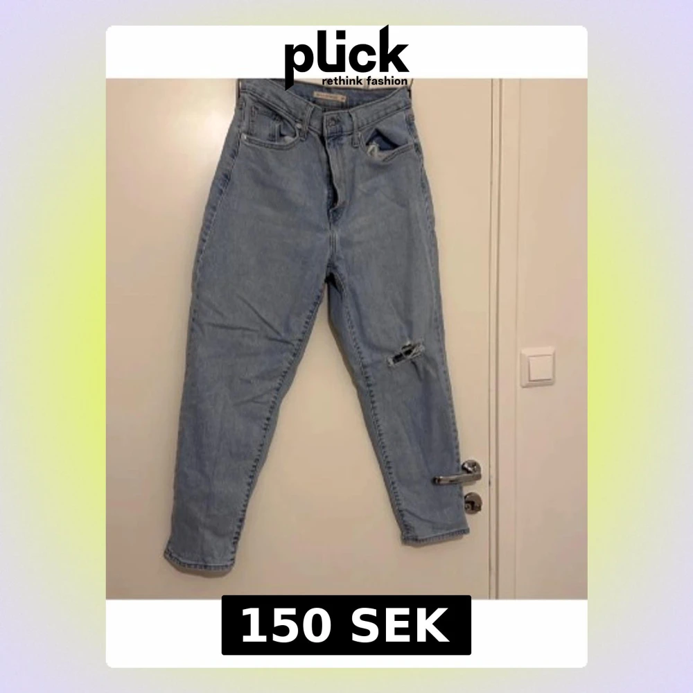 Ljusblå high waisted mom jeans från Levi's med klassisk femficksdesign, dragkedja och knapp. Jeansen har en avslappnad passform och ett snyggt slitet hål på ena knät för en trendig look. Perfekta för dig som gillar vintage vibe och bekväma jeans. Passar mig som är 160. Storlek 29 längd 27