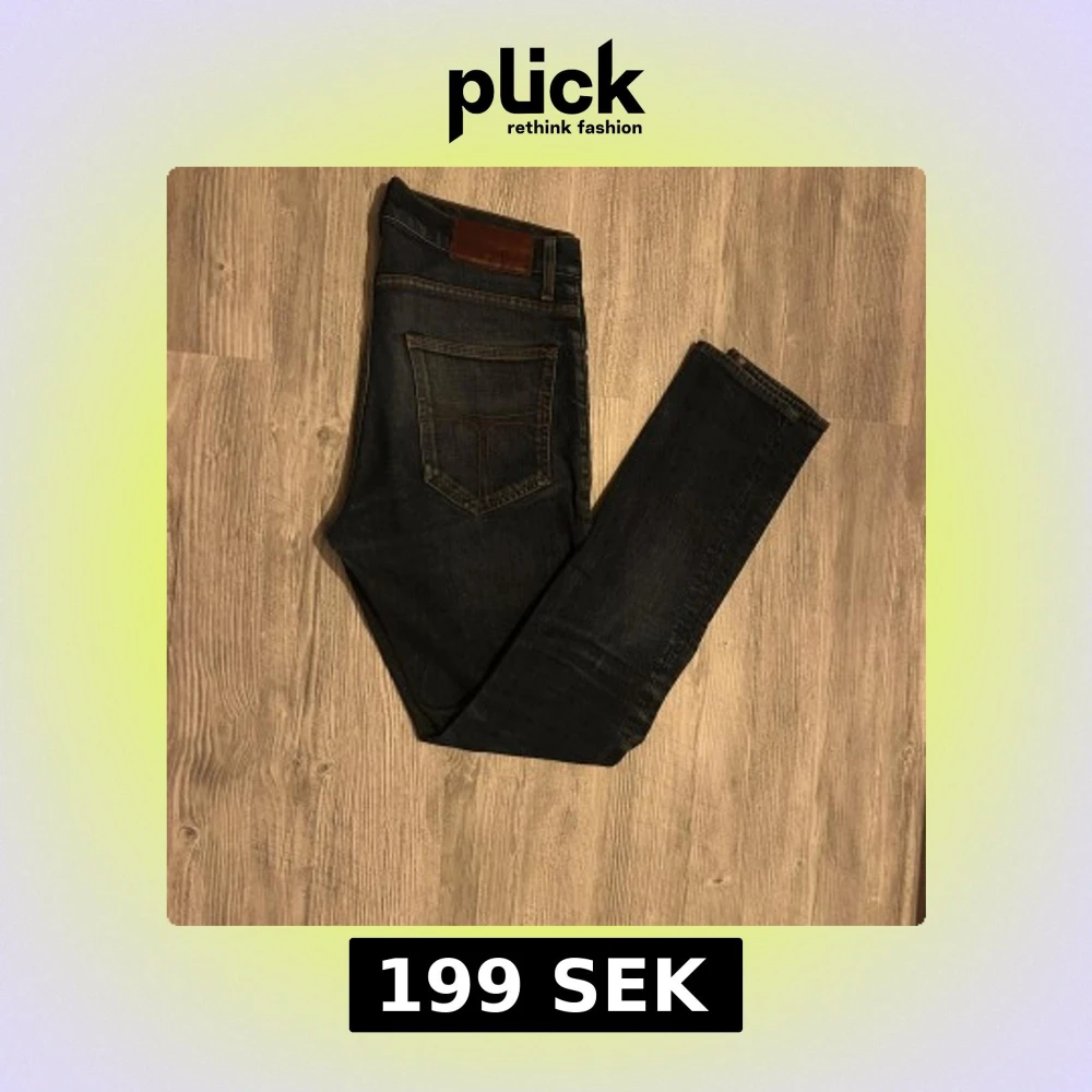 Snygga mörkblå jeans från Tiger of Sweden med klassisk femficksdesign och brunt läderpatch bak i midjan. Jeansen har smal passform och diskreta slitningar på benen för en cool look. Perfekta till sneakers eller boots.