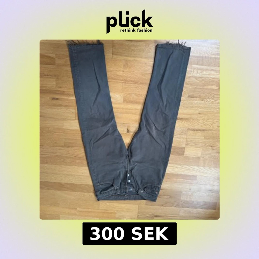 Säljer ett par gröna Levis 501 jeans med fransiga benslut. De har en klassisk femficksdesign och knappgylf. Perfekta för en avslappnad stil.