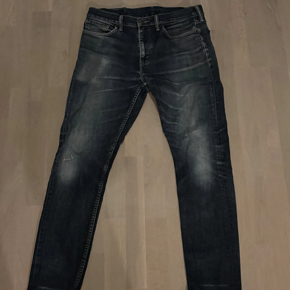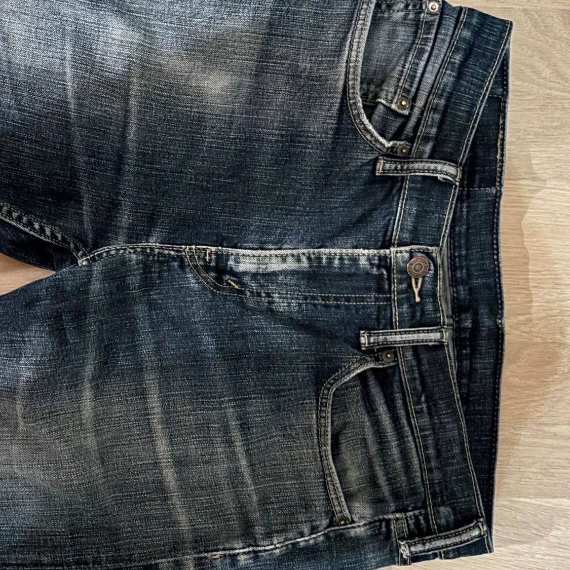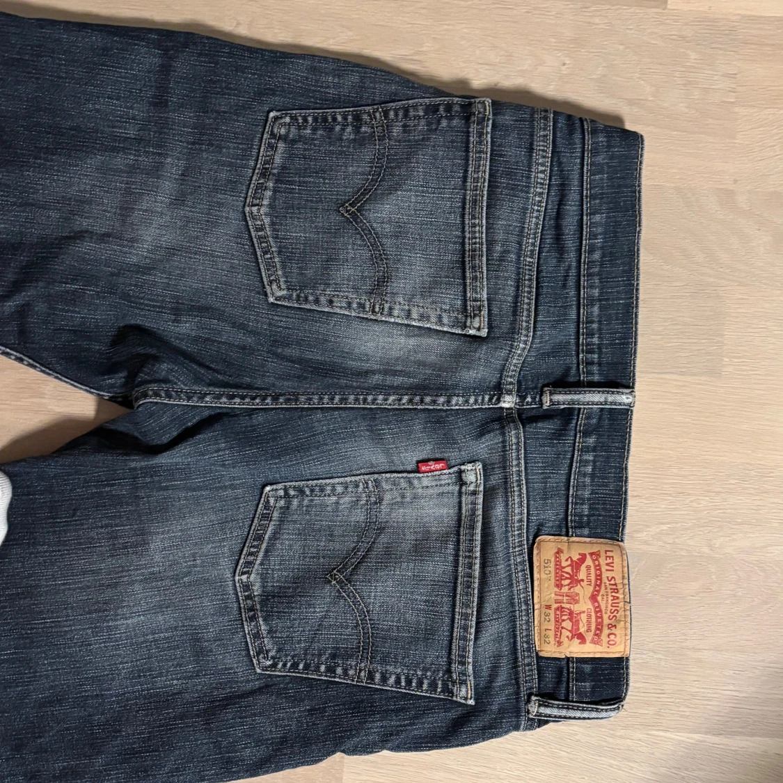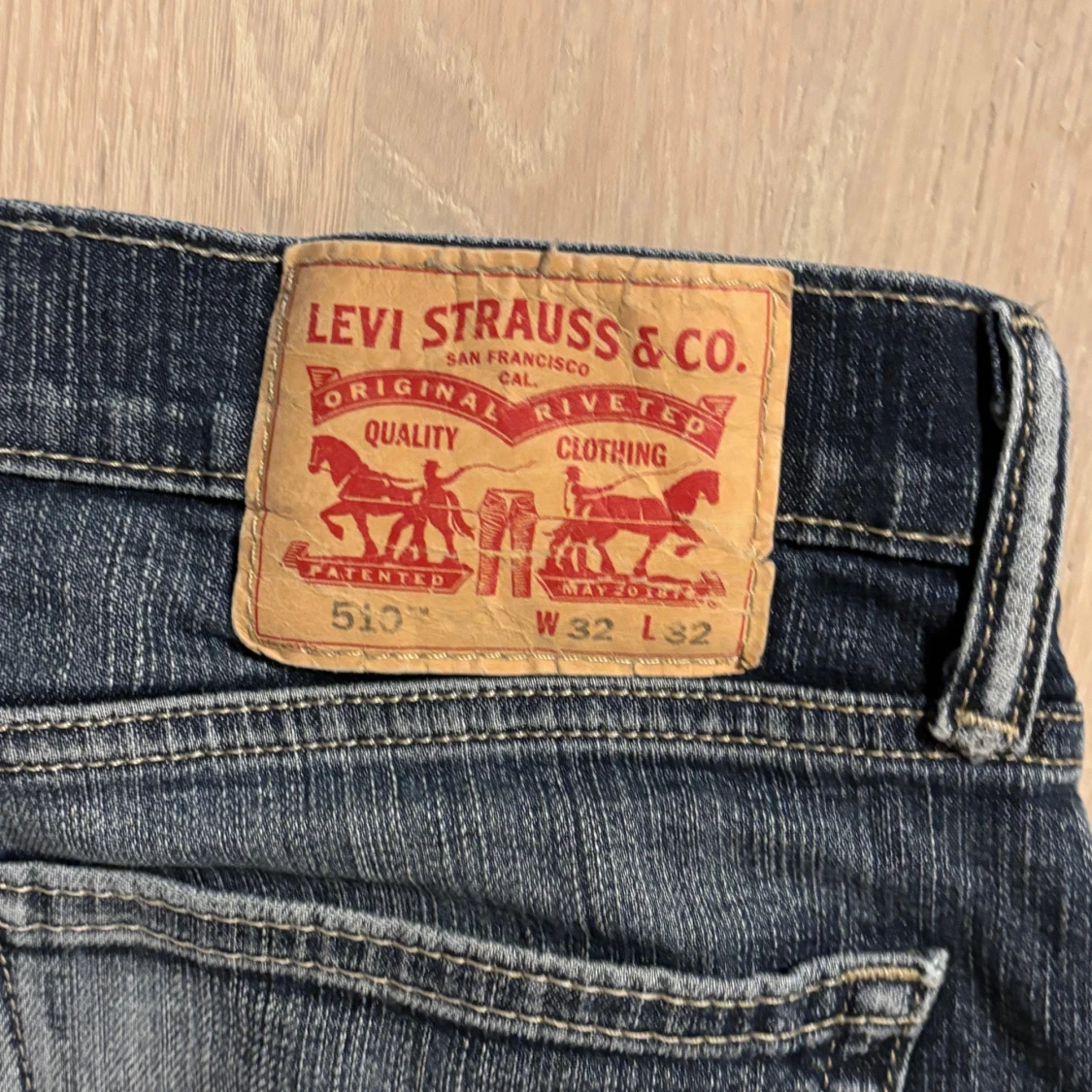Snygga Levi's 515 jeans i mörkblå tvätt med slitningar och klassiska fem fickor. Jeansen har en smal passform och raka ben, med detaljer som synliga sömmar och läderpatch bak i midjan. Perfekta för en avslappnad och trendig look.