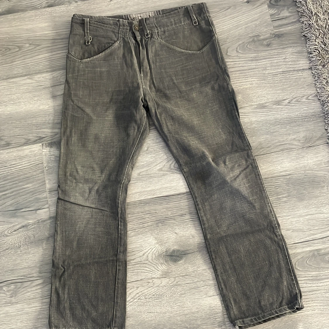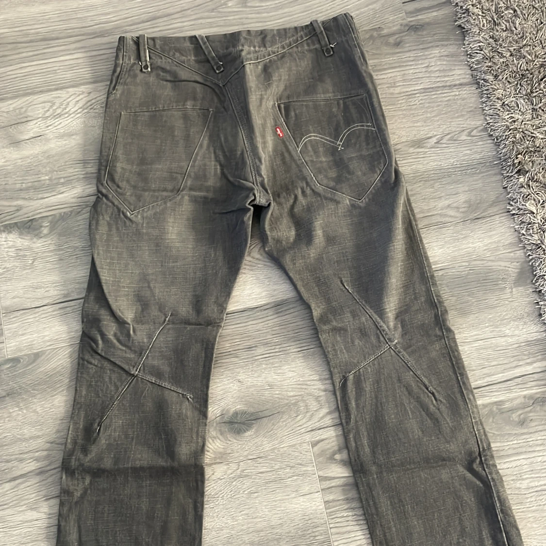 Säljer ett par grå jeansbyxor från Levi's med klassiska fem fickor och raka ben. Byxorna har synliga sömmar och knappgylf. Passar perfekt till dig som gillar en enkel och stilren look.