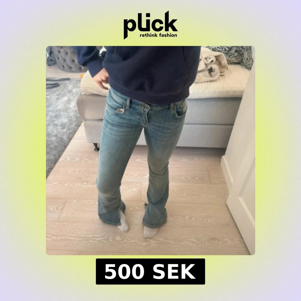 Säljer ett par ljusblå jeans med klassisk femficksdesign och bootcut-ben. Jeansen har låg midja och är tillverkade i mjukt denimtyg. Perfekta för dig som gillar en avslappnad men ändå snygg stil. Italiensk storlek 40 men är en 34/36