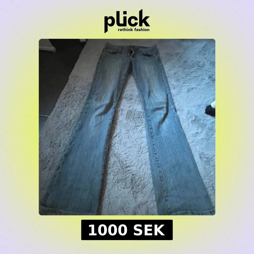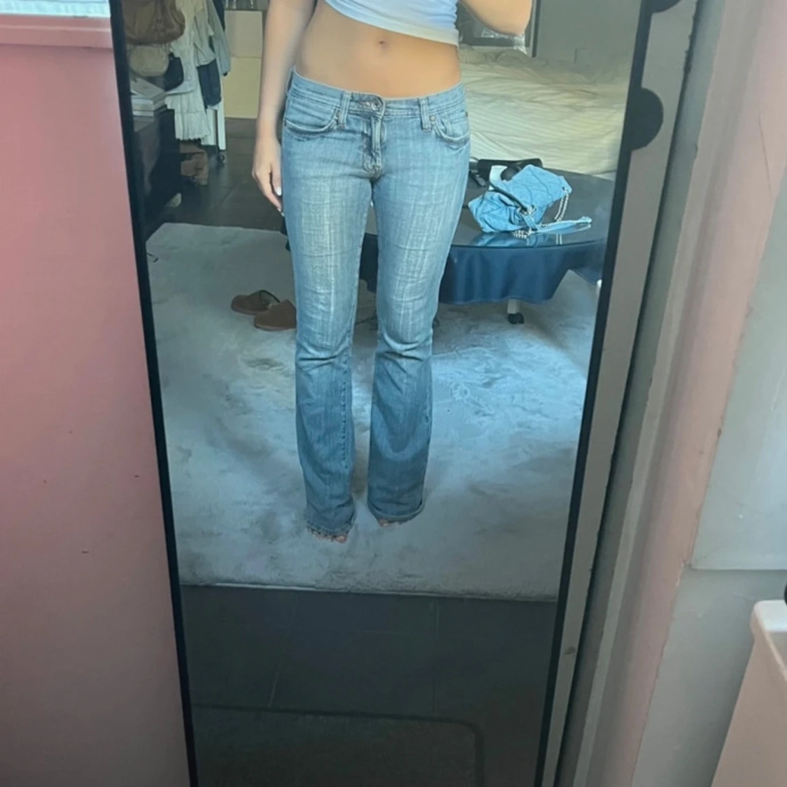 Ljusblå Levis jeans med bootcut passform och låg midja. Klassisk femficksmodell med snygga detaljer på bakfickorna och lätt slitning framtill. Perfekta för dig som gillar en retro vibe och vill ha ett par jeans som sitter snyggt över höften. Måtten är 34/36 jeansen är köpta secondhand i Paris lite slitna