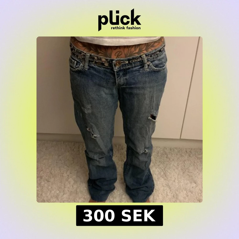 Säljer ett par klassiska sixsis jeans i blå tvätt med coola slitningar och hål på benen. Modellen har rak passform och låg midja, samt fem fickor och knappgylf. Perfekt för dig som gillar en avslappnad och edgy stil. Midjemått: 37xm