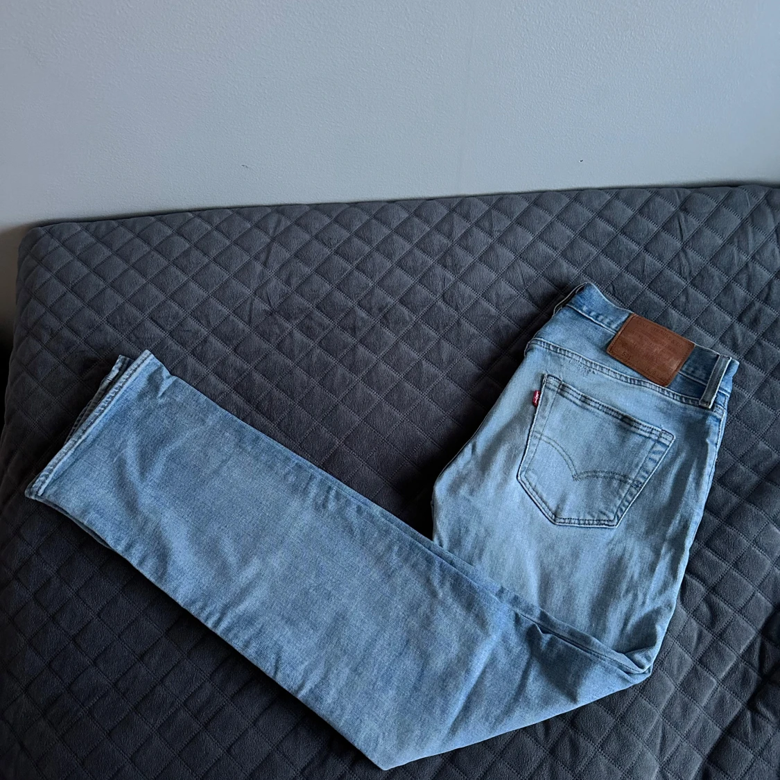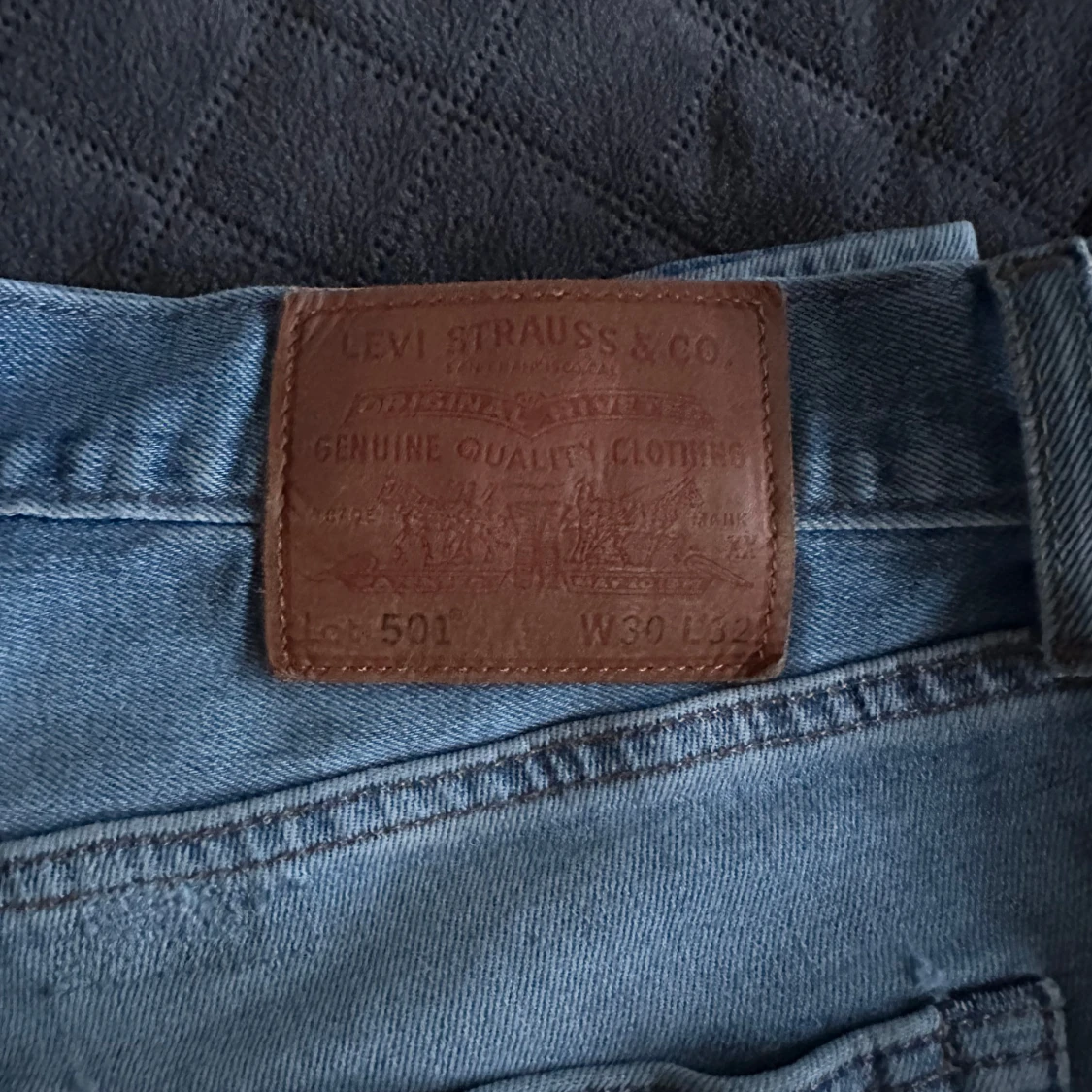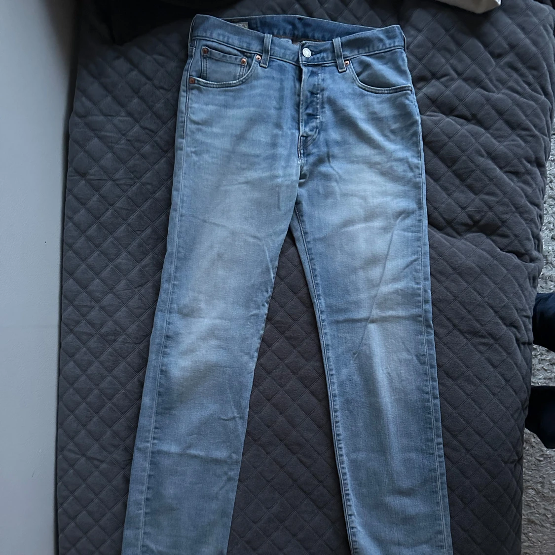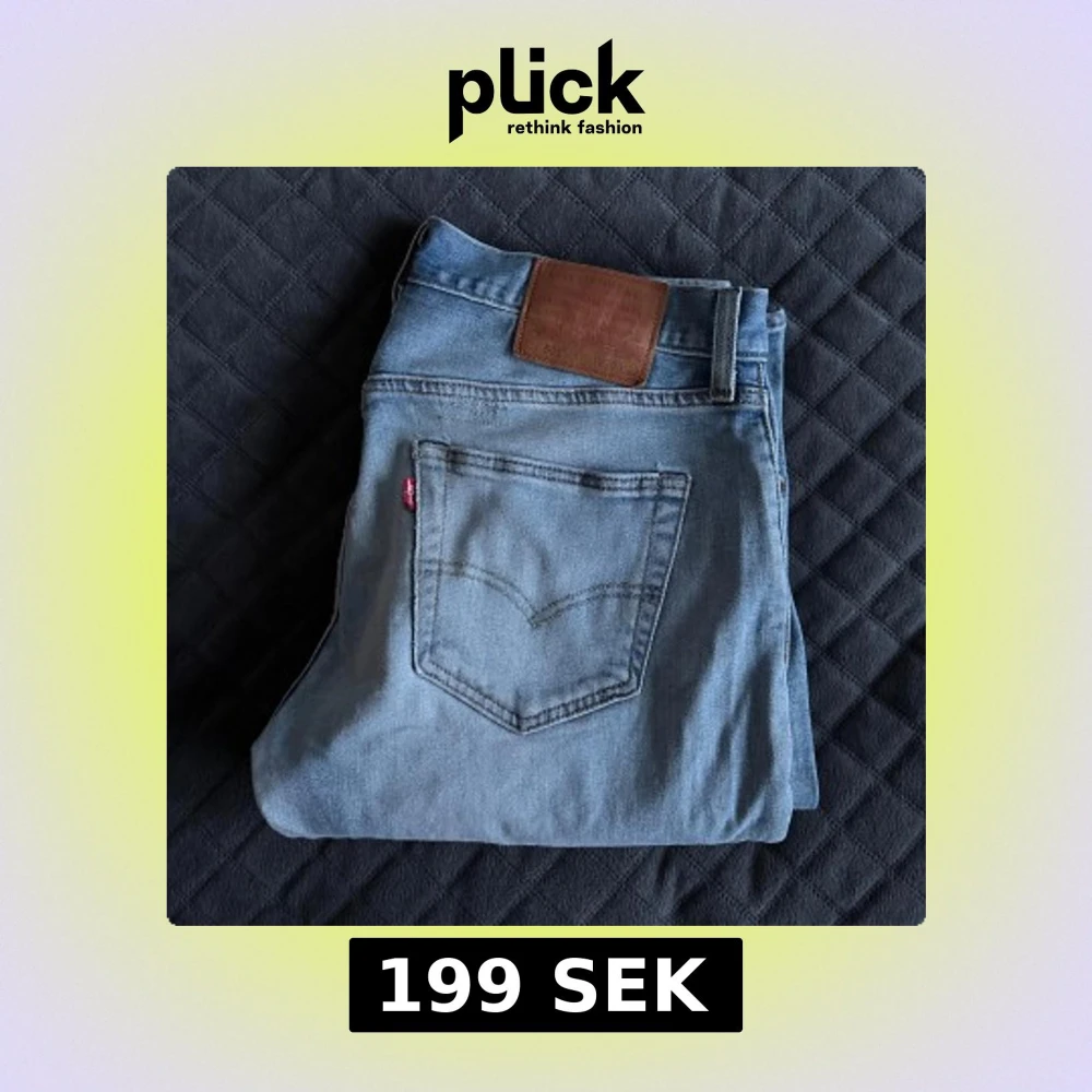 Säljer ett par klassiska Levis 501 jeans i ljusblå denim. De har en rak passform och är tillverkade i slitstarkt jeanstyg. Perfekta för en avslappnad stil. Jeansens ikoniska läderpatch och röda etikett på bakfickan ger en tidlös look.