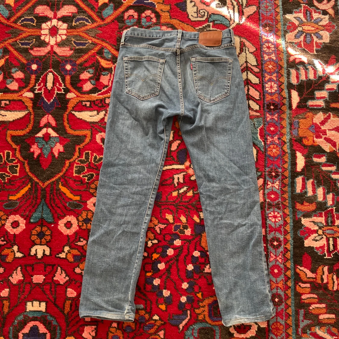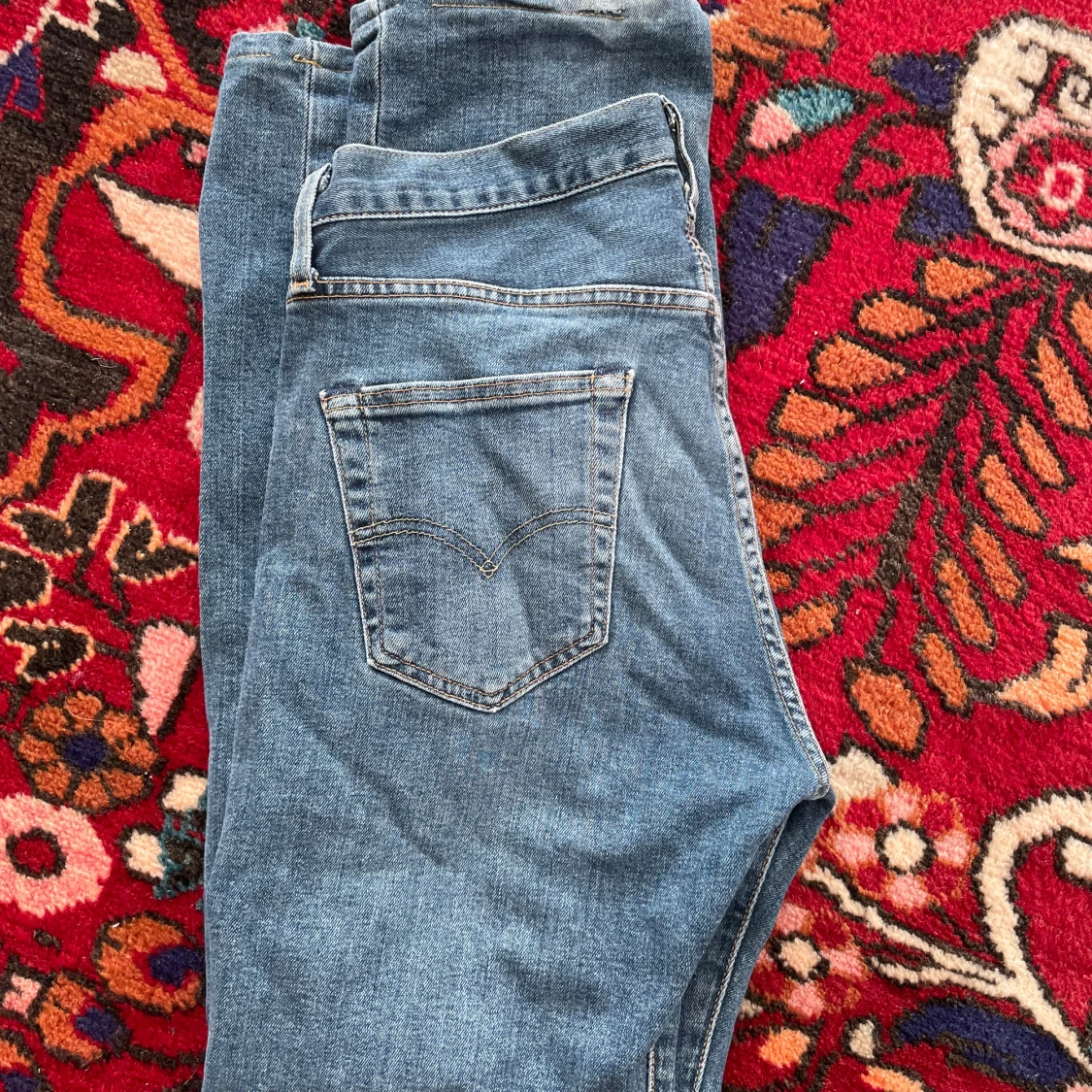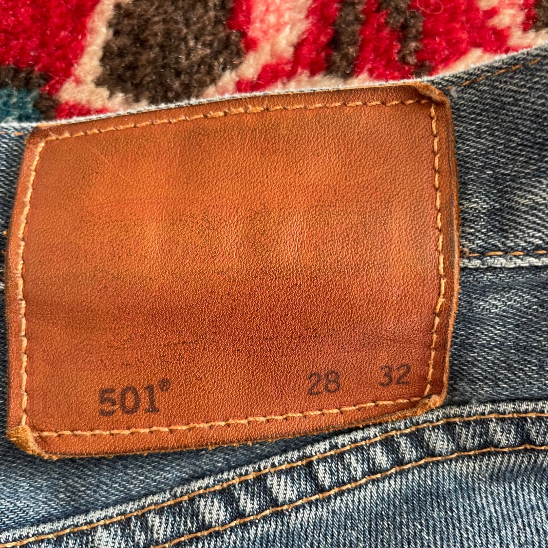 Klassiska Levis 501 jeans i blå denim. De har en rak passform och är tillverkade i slitstarkt bomullsmaterial. Jeansens design inkluderar fem fickor och en knappgylf. Perfekta för en tidlös stil.