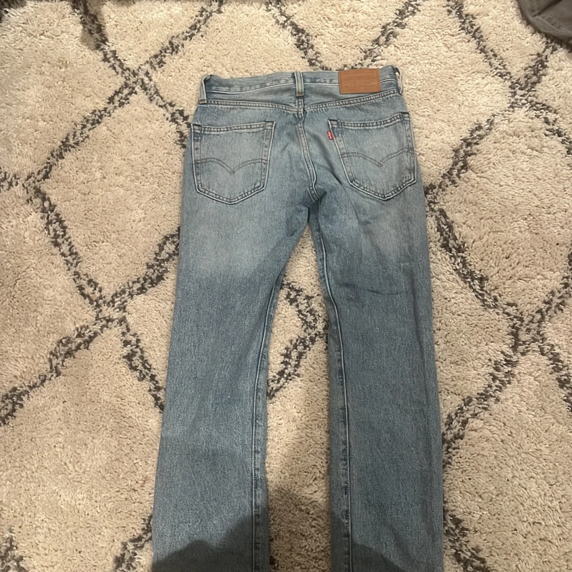 Klassiska Levis 501 jeans i ljusblå denim med raka ben och femficksmodell. Byxorna har knappgylf och den ikoniska Levis-lappen bak i midjan. Perfekta för en avslappnad stil.