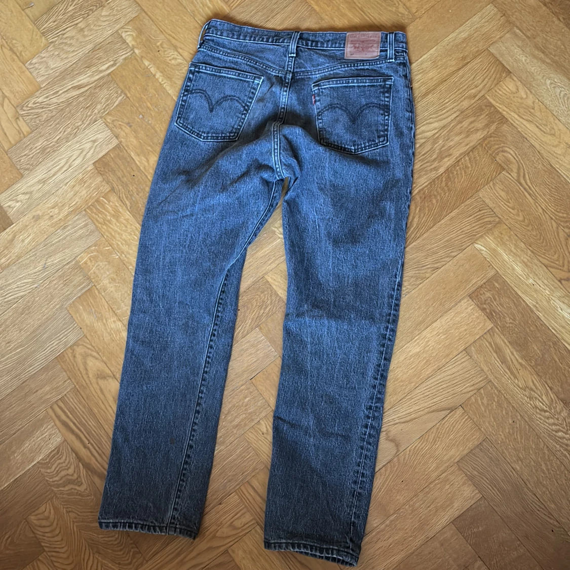Klassiska gråa jeansbyxor med en rak passform. De har en traditionell femficksdesign och knappar i midjan. Perfekta för en avslappnad stil.