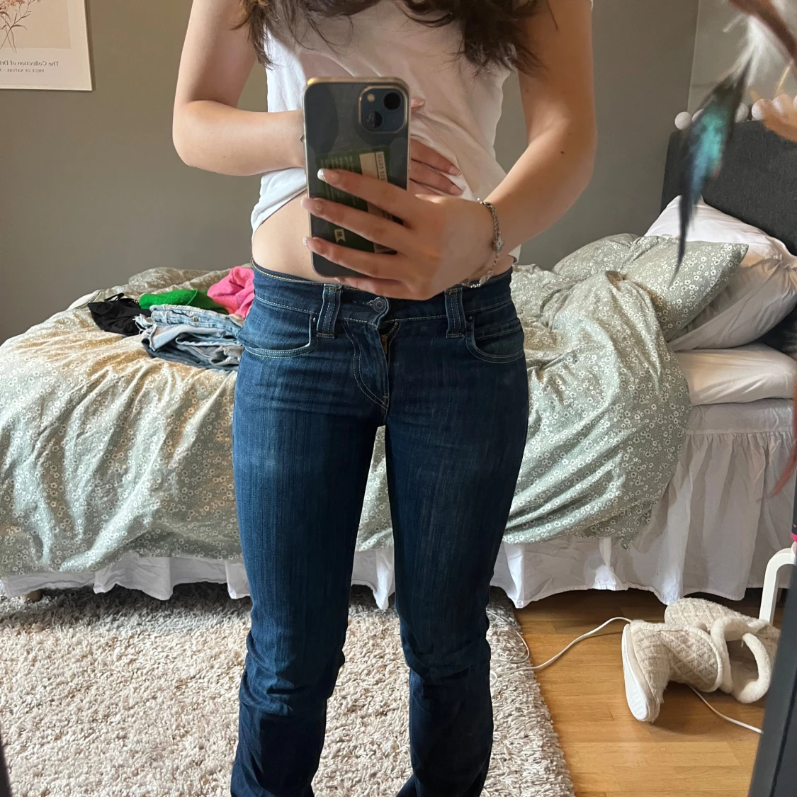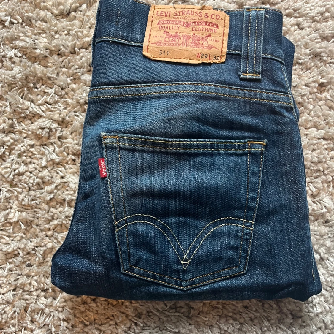 Säljer ett par klassiska Levis 511 jeans i mörkblå denim. De har en slim passform och är perfekta för en stilren look. Jeansen har fem fickor och en knappgylf. Low waist