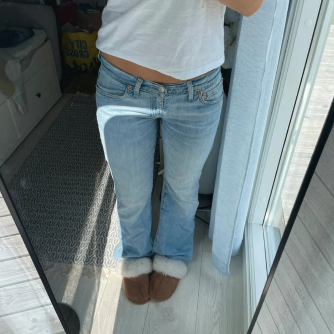 Säljer ett par Levis jeans i ljusblå tvätt med bootcut passform och låg midja. Nersprättade där nere så att de passar mig som är 165 (kan även passa längre) men är annars i väldigt bra skick. midjemått 38 cm.