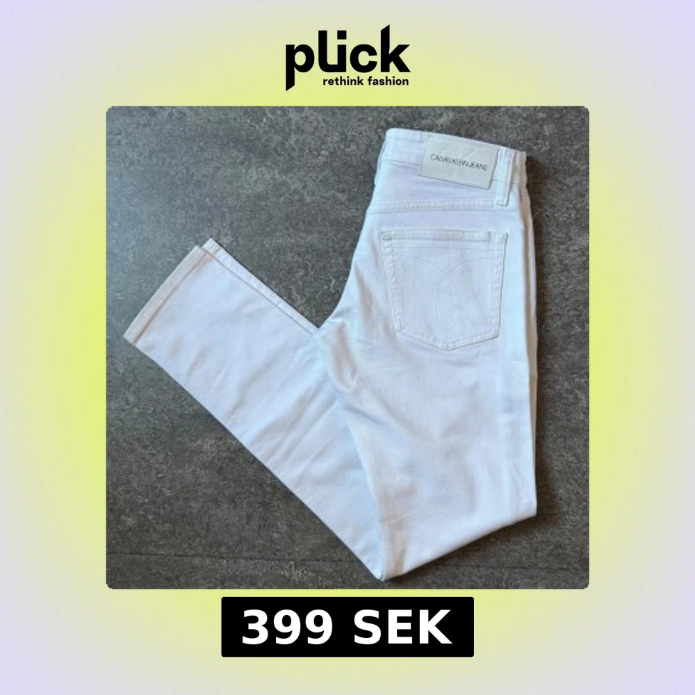 Tjena! Säljer dessa snygga vita jeans från Calvin Klein. Mycket bra skick, använda enbart en gång. De passar för formella och avslappnade outfits. Perfekt för våren 🙌. Säljer dem för endast 399kr (Nypris: 1299kr). Kvittot medföljer.