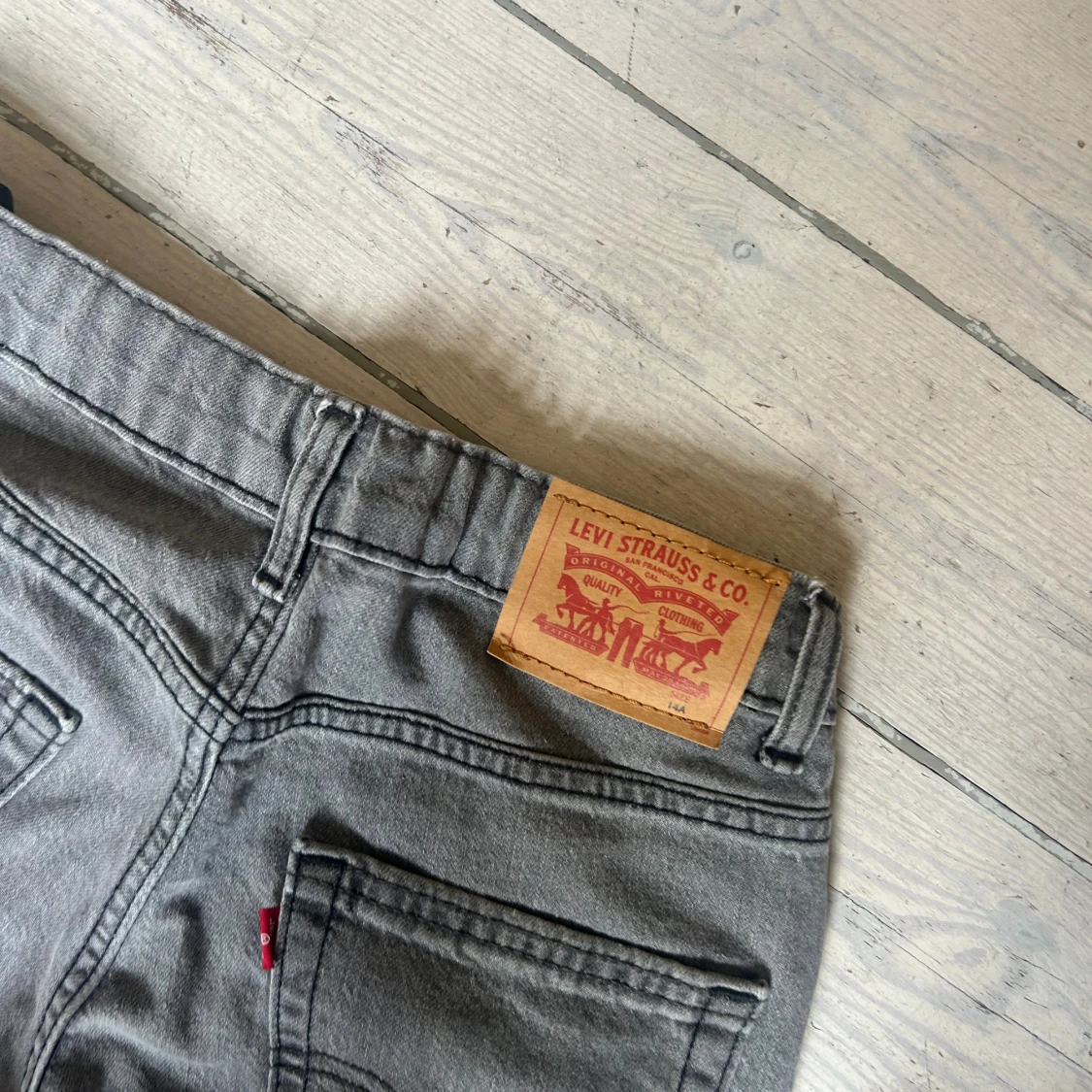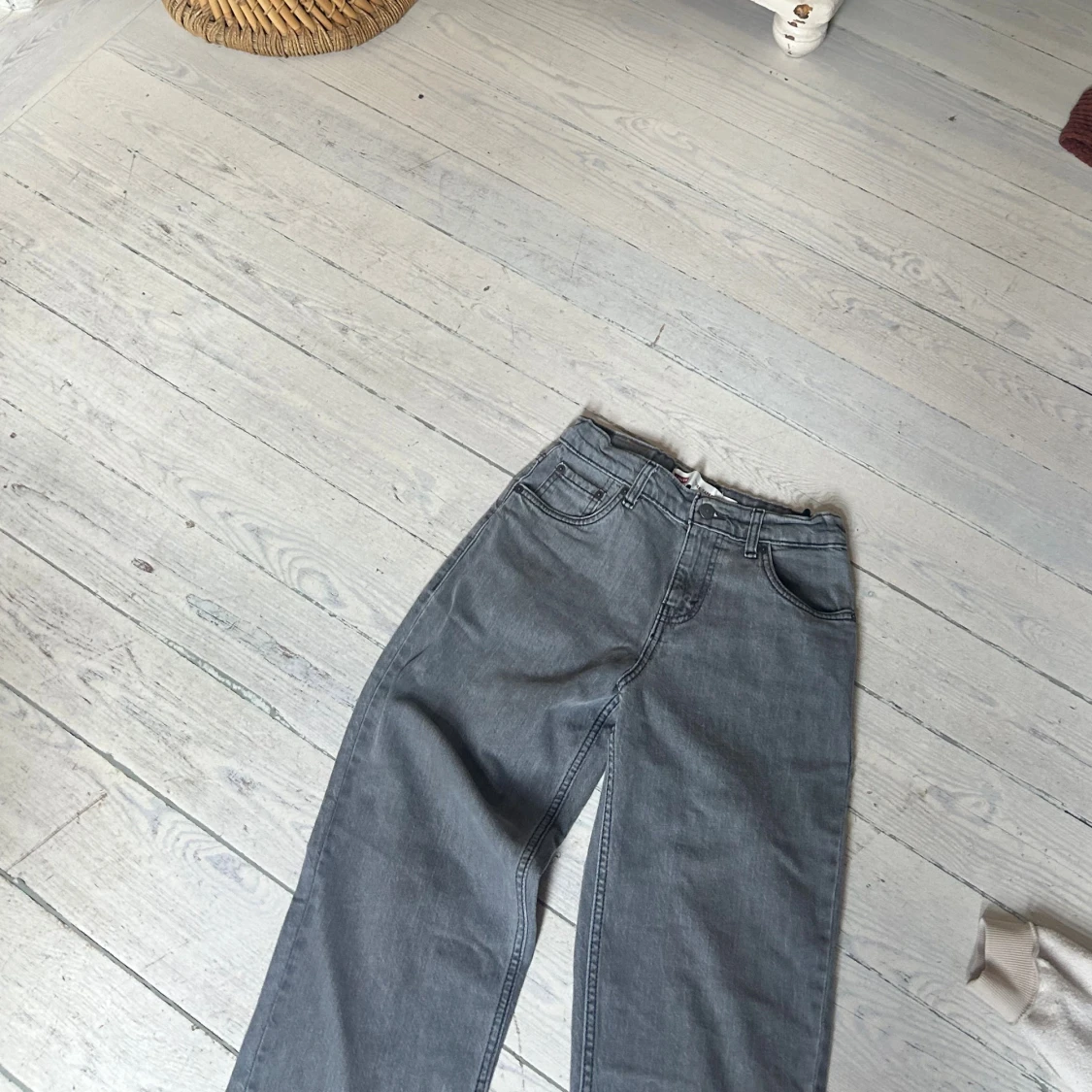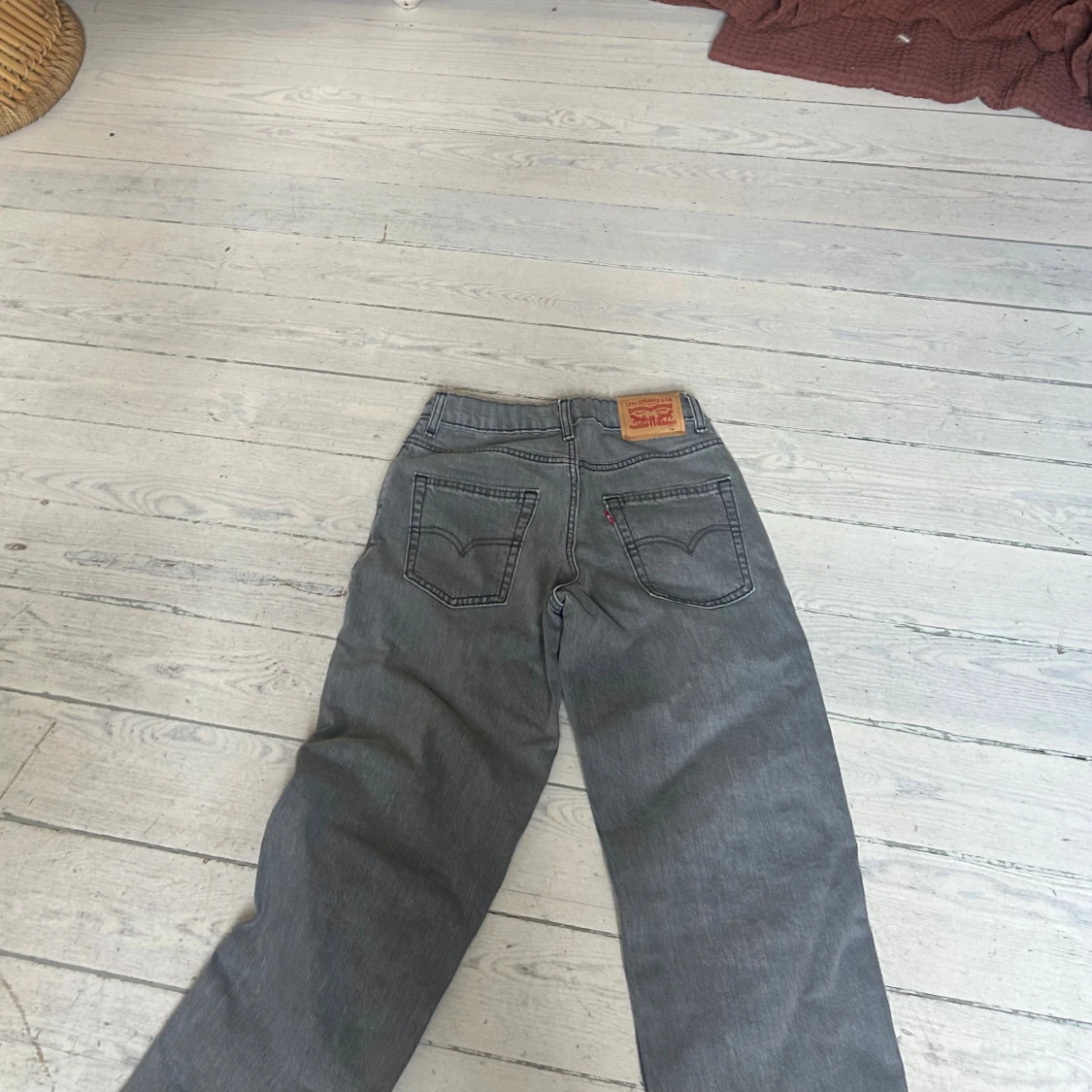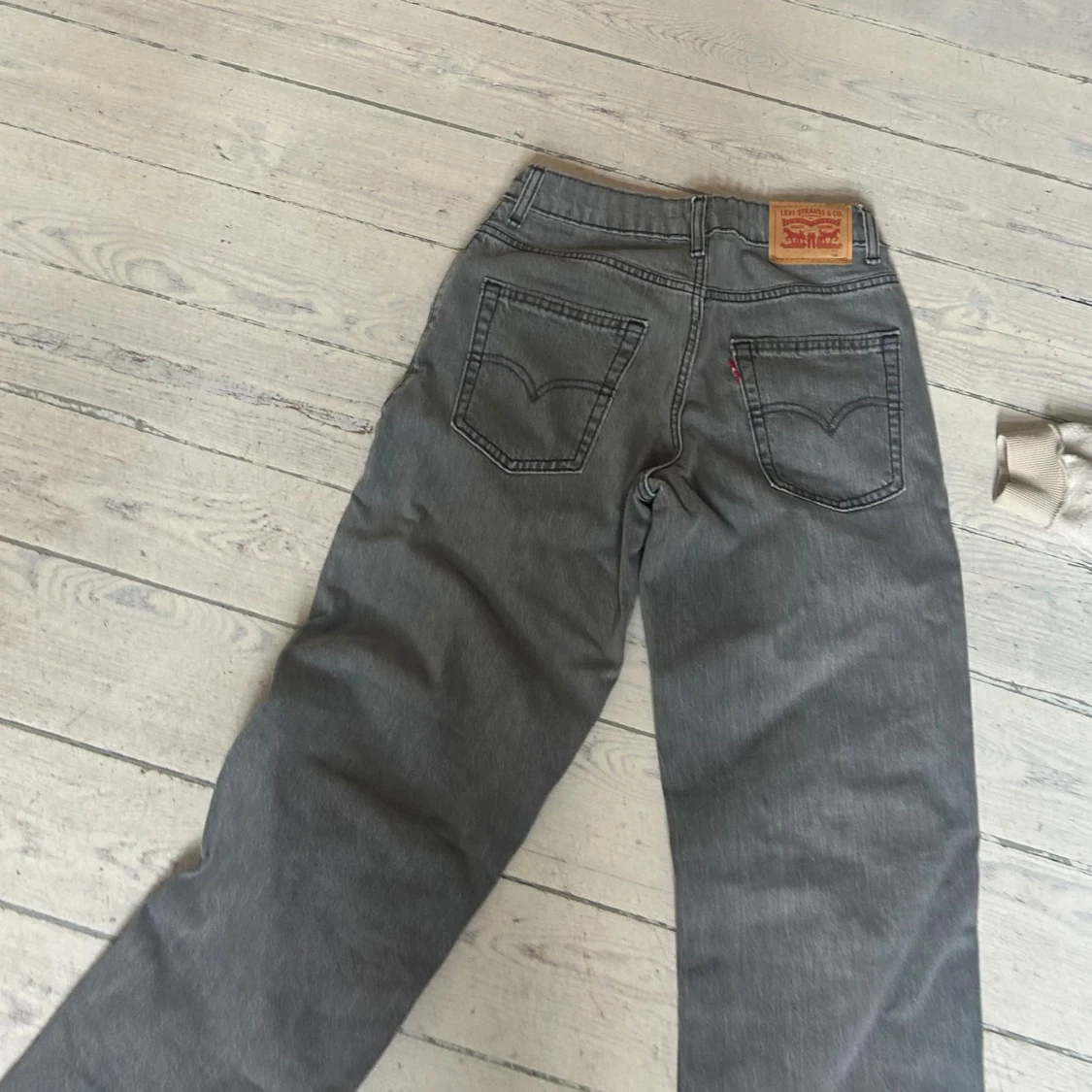 Tja Säljer ett par gråa Levi's jeans med klassisk femficksdesign och raka ben. Jeansen har hög midja och tydliga sömmar, samt den ikoniska läderpatchen bak i midjan. Perfekta för en chill och stilren look. Kom gärna med frågor och pris förslag