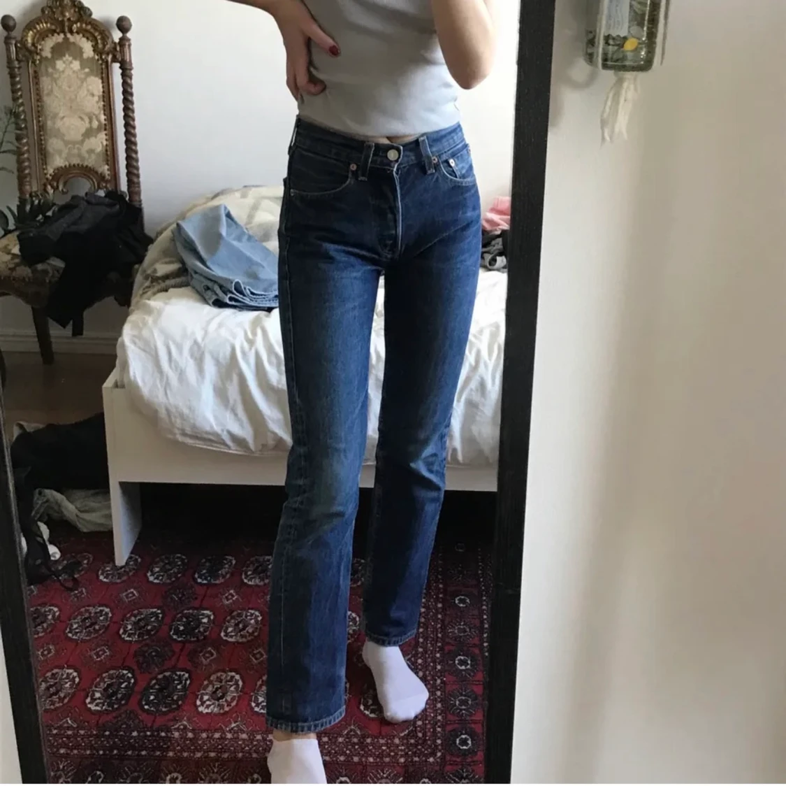 Mörkblå Levis jeans i modell 501! Jättesnygga men tyvärr för små för mig. Köpta här på Plick (lånade bilder)