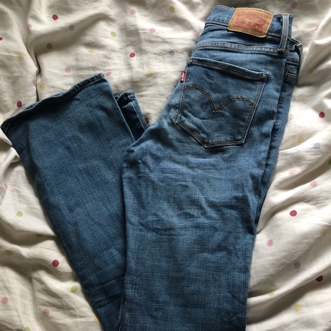 Säljer mina Levis Jeans Bootcut då dom blivit för små för mig, dom är använda men fortfarande i bra skick. Inga hål/fläckar. Färgen är Ljusblå, skulle säga att de passar en Xs- liten M beroende på hur man vill att de ska sitta. Skicka ett dm för fler bilder, frågor eller diskutera pris. Tvättas innan jag fraktar då hund finns i hemmet! :)