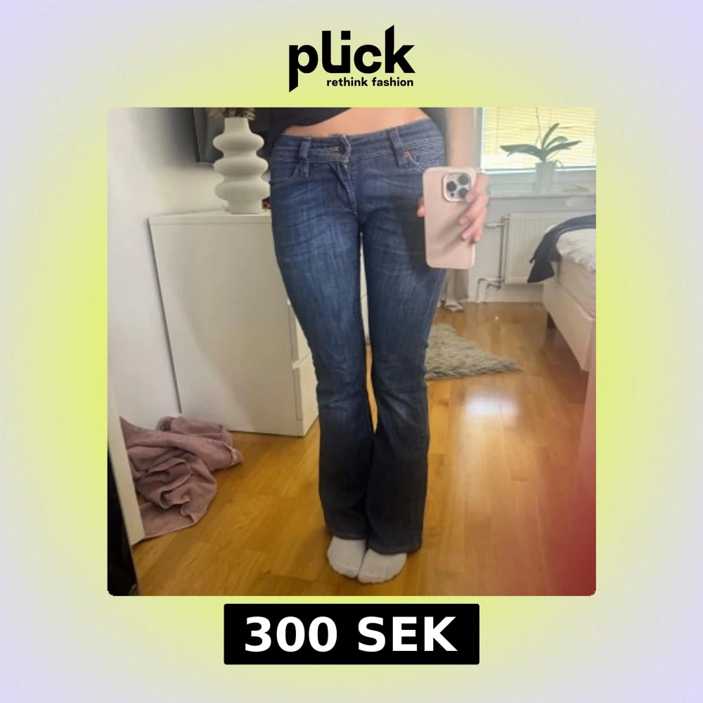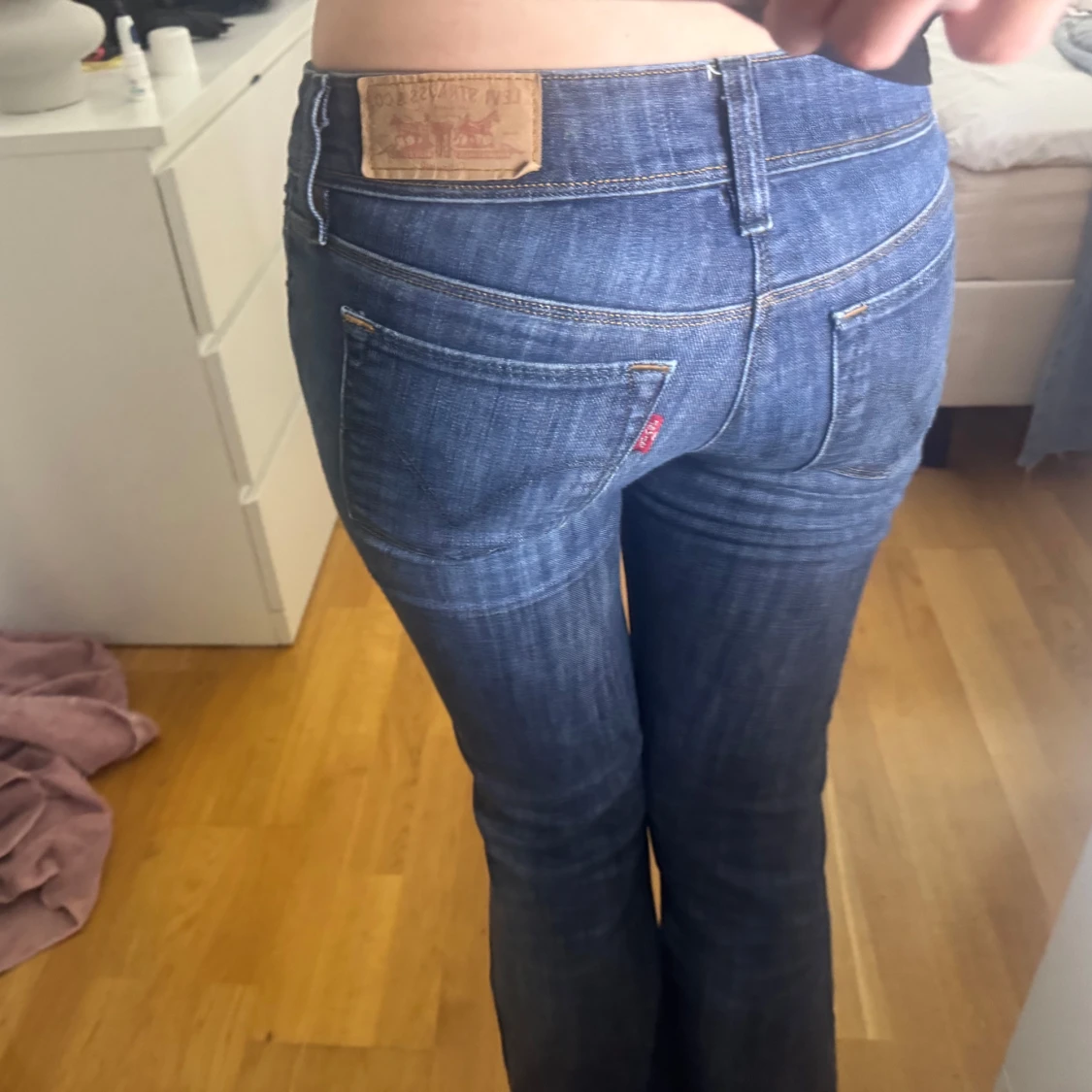Säljer ett par klassiska Levis 527 jeans i blå denim med bootcut passform. Jeansen har fem fickor, normalhög midja och snygga detaljer som Levis-lapp bak och röd etikett på bakfickan. Perfekta för dig som gillar en tidlös och avslappnad stil.