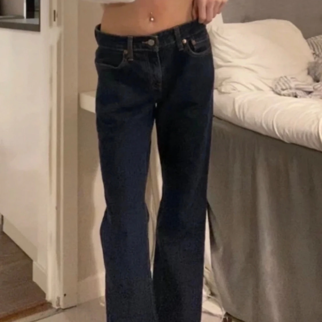 Lågmidjade Levis jeans i jättefin mörkblå färg. Modellen 515 bootcut. Skulle säga att de passar xs/s.