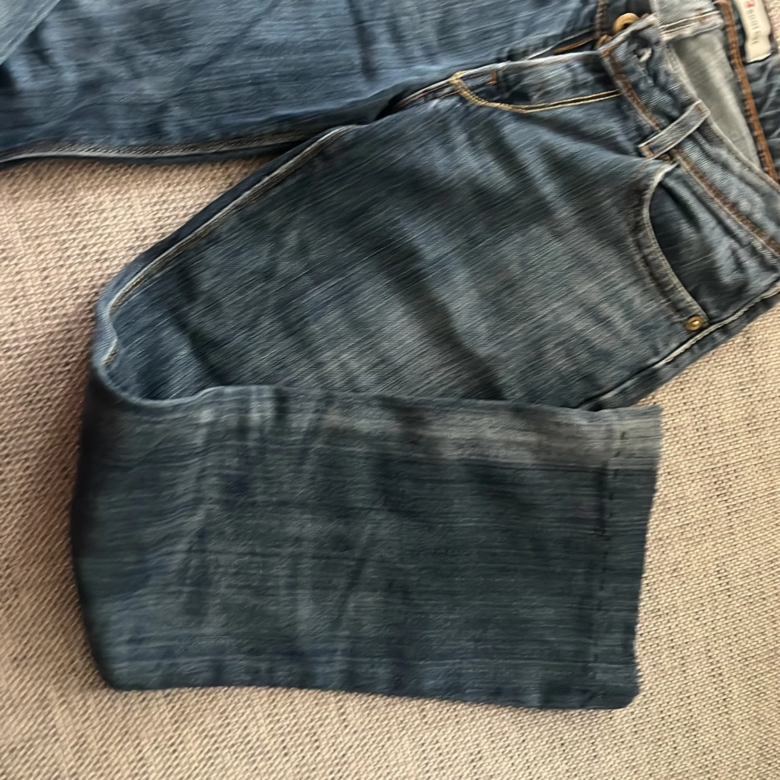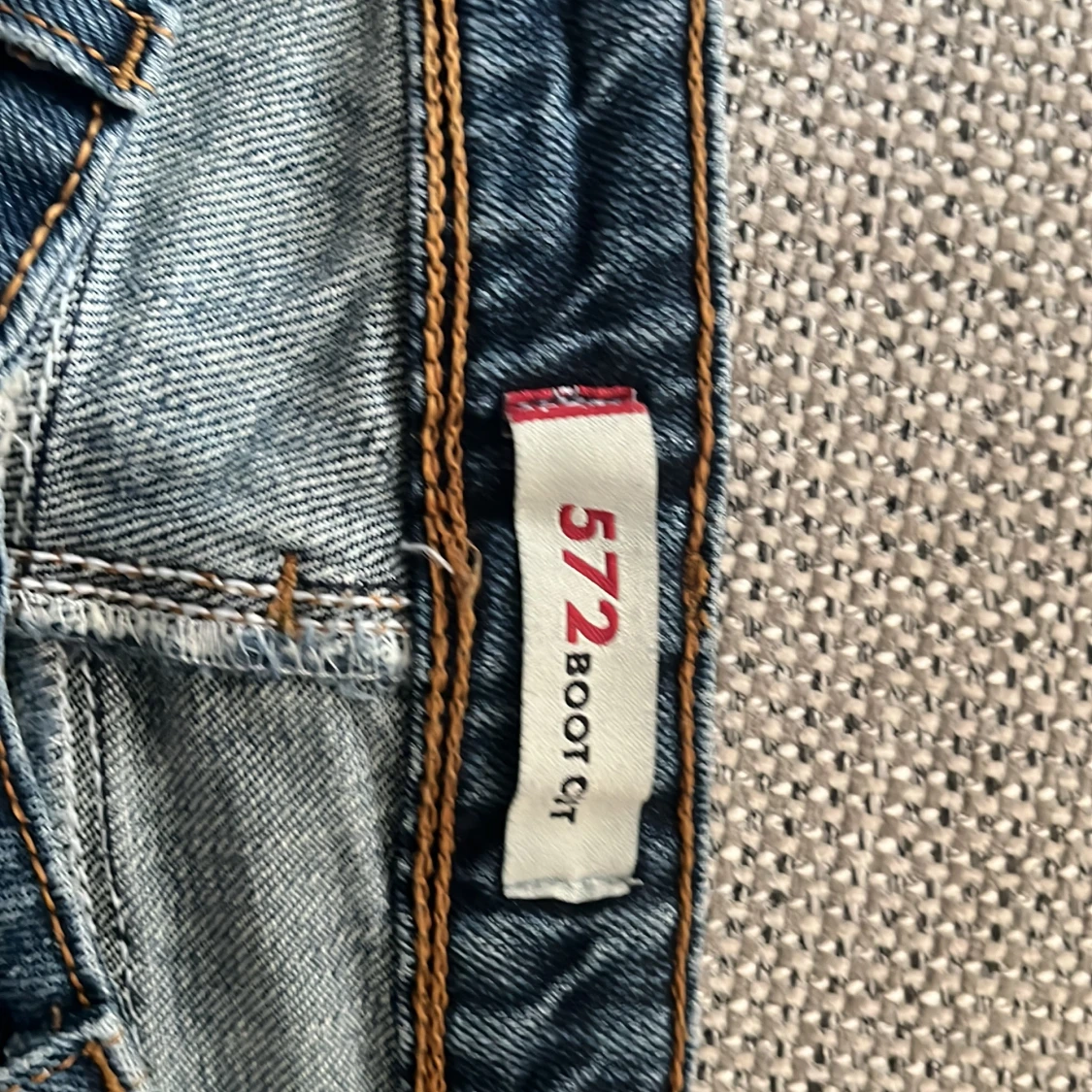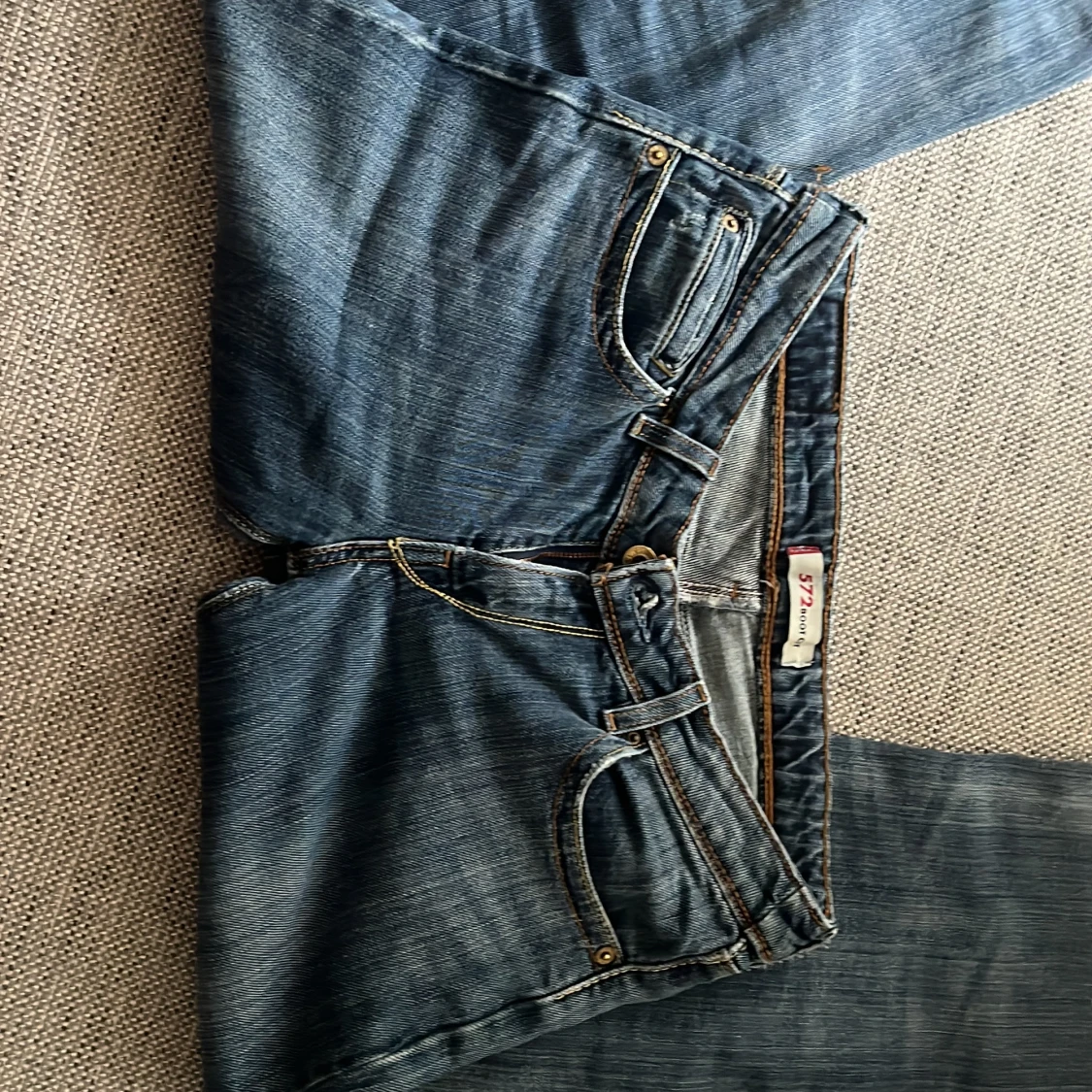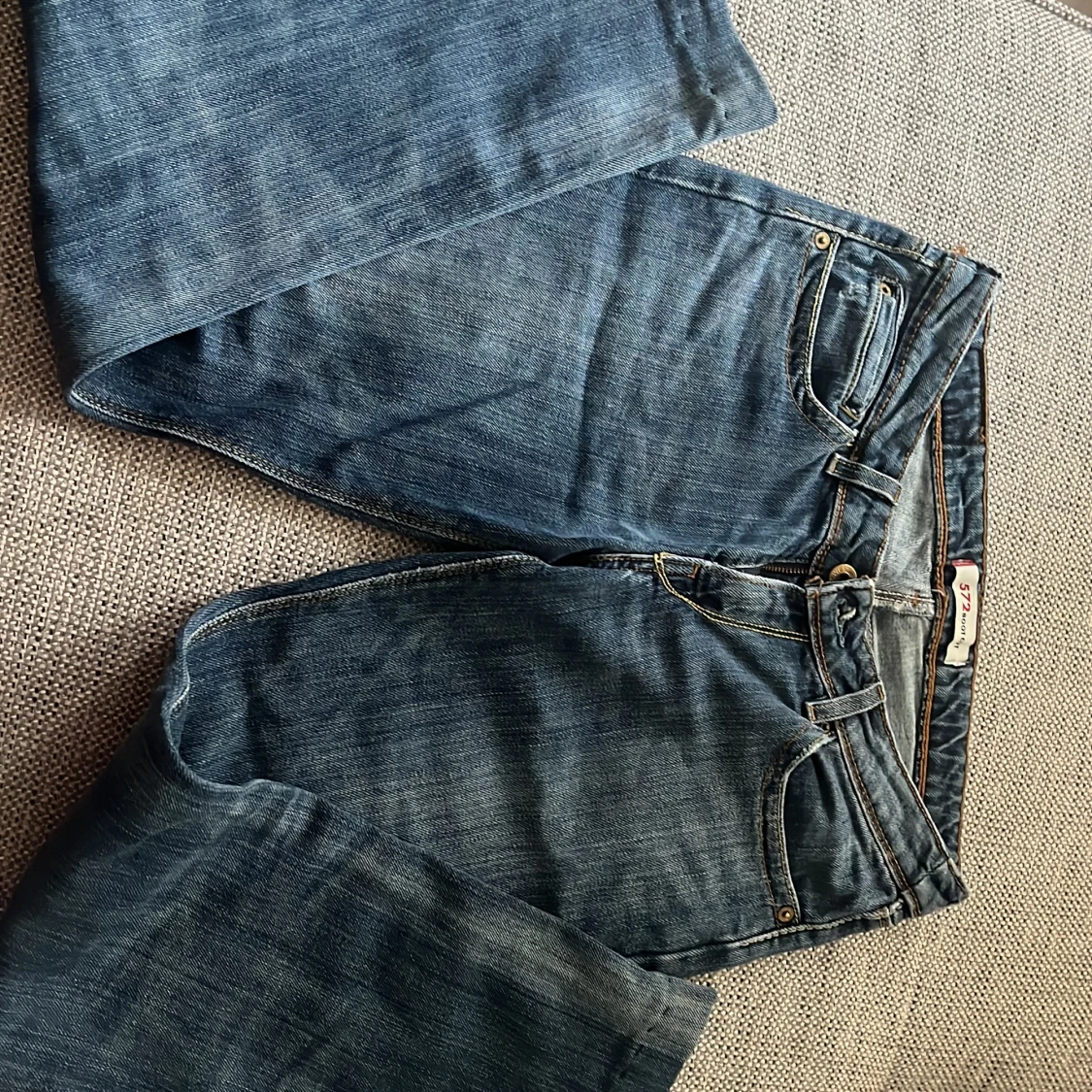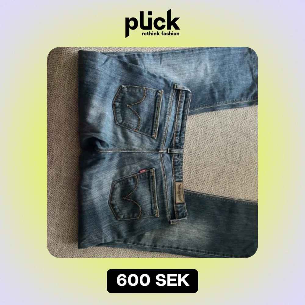 Lågmidjade bootcut levis jeans med tryck på fickorna. De är sydda längst ner för de lite för långa på mig men det kan man lätt bara klippa bort om man vill. Skriv privat för pris eller frågor🙏🏼