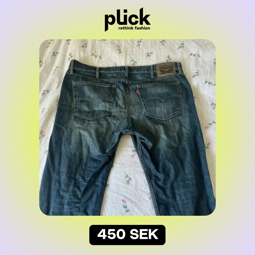 Raka Levi’s jeans i storlek 38/30 vilket motsvarar ungefär en storlek L-XL. Midjemåttet tvärsöver är 49cm (ca 98cm runtom) och innerbenslängden är 75cm långt.