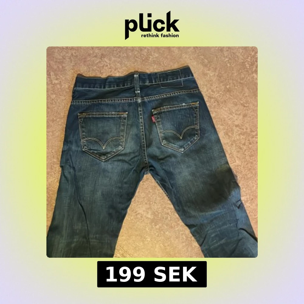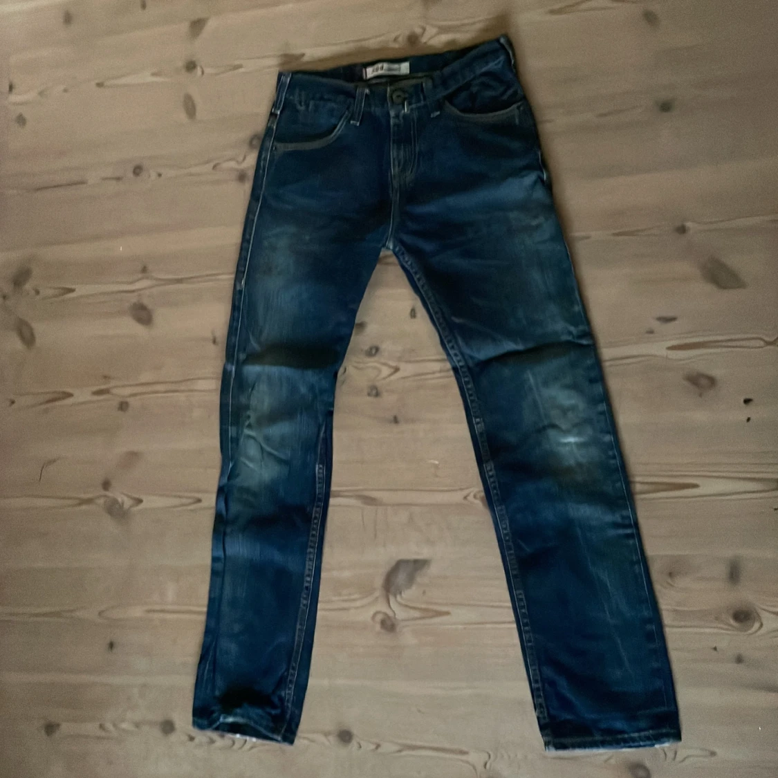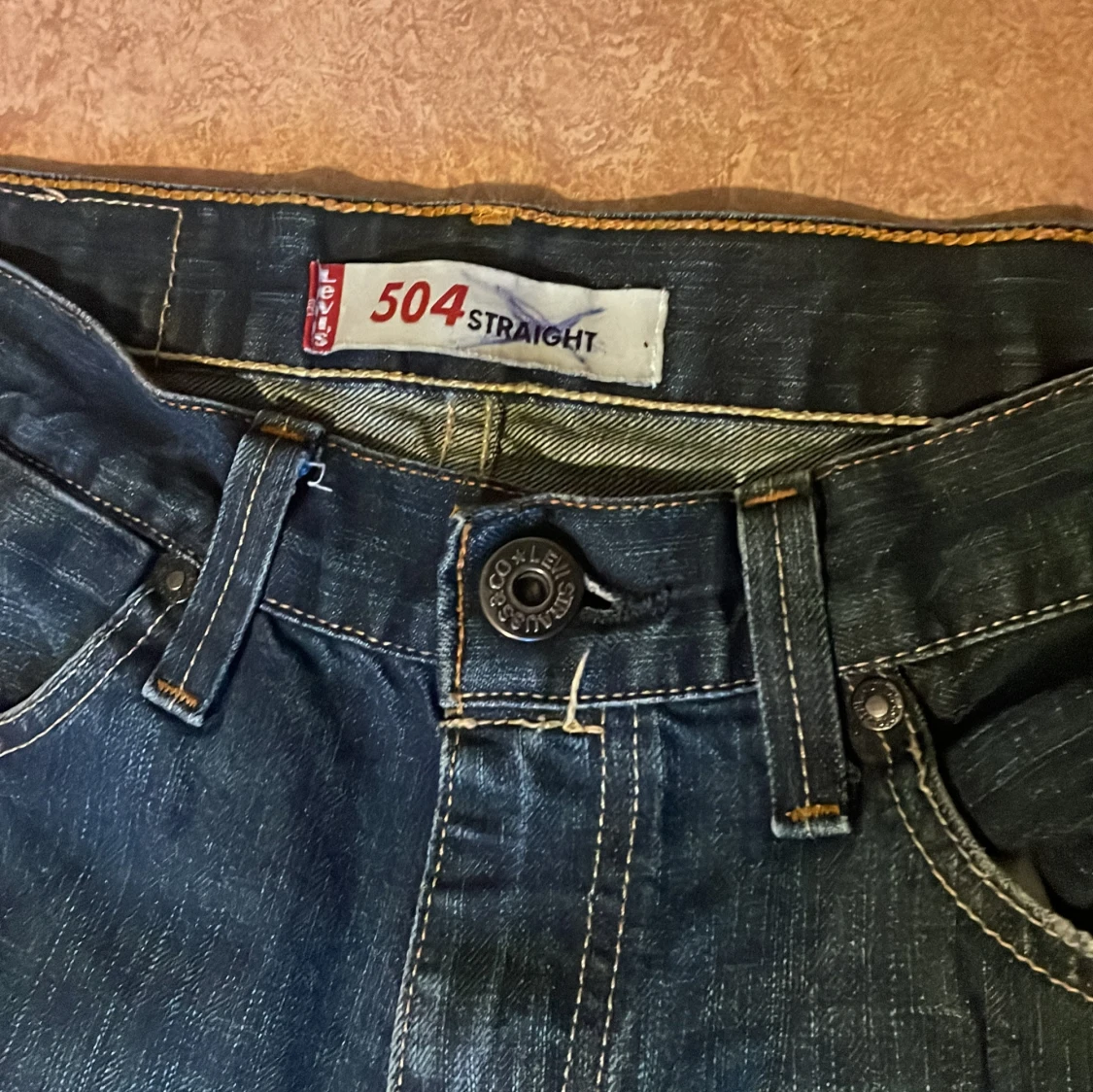 Säljer ett par Levi's 504 Straight jeans i mörkblå denim med klassiska kontrastsömmar och femficksdesign. Jeansen har rak passform och normal midja. Ikonisk Levi's-logga på bakfickan och slitna detaljer. Innerben 76cm längd 105cm