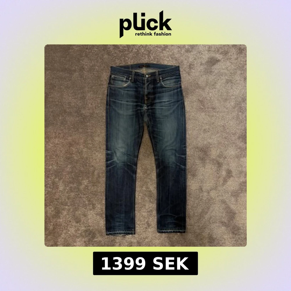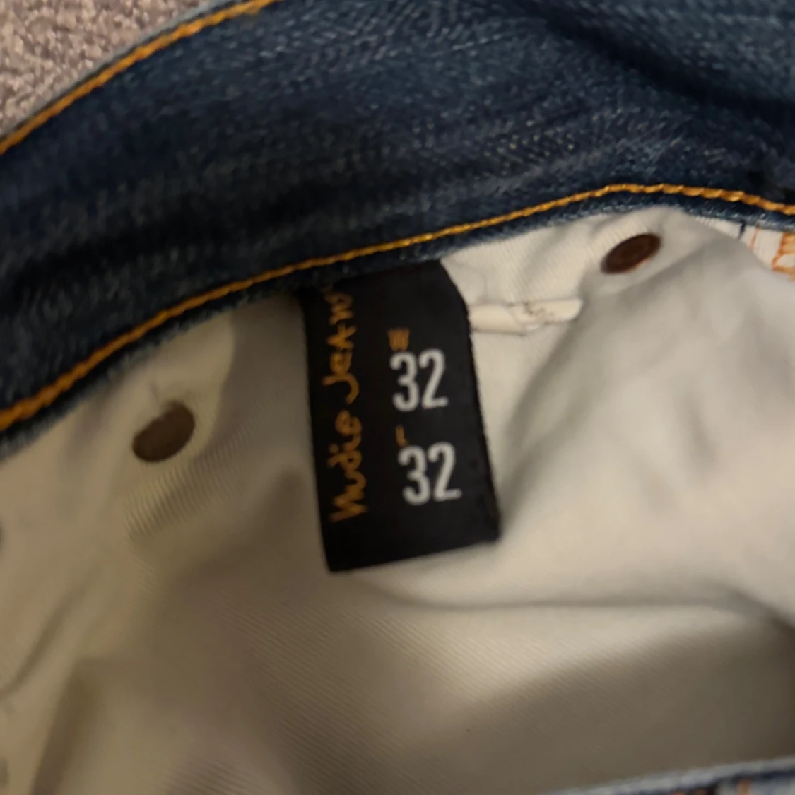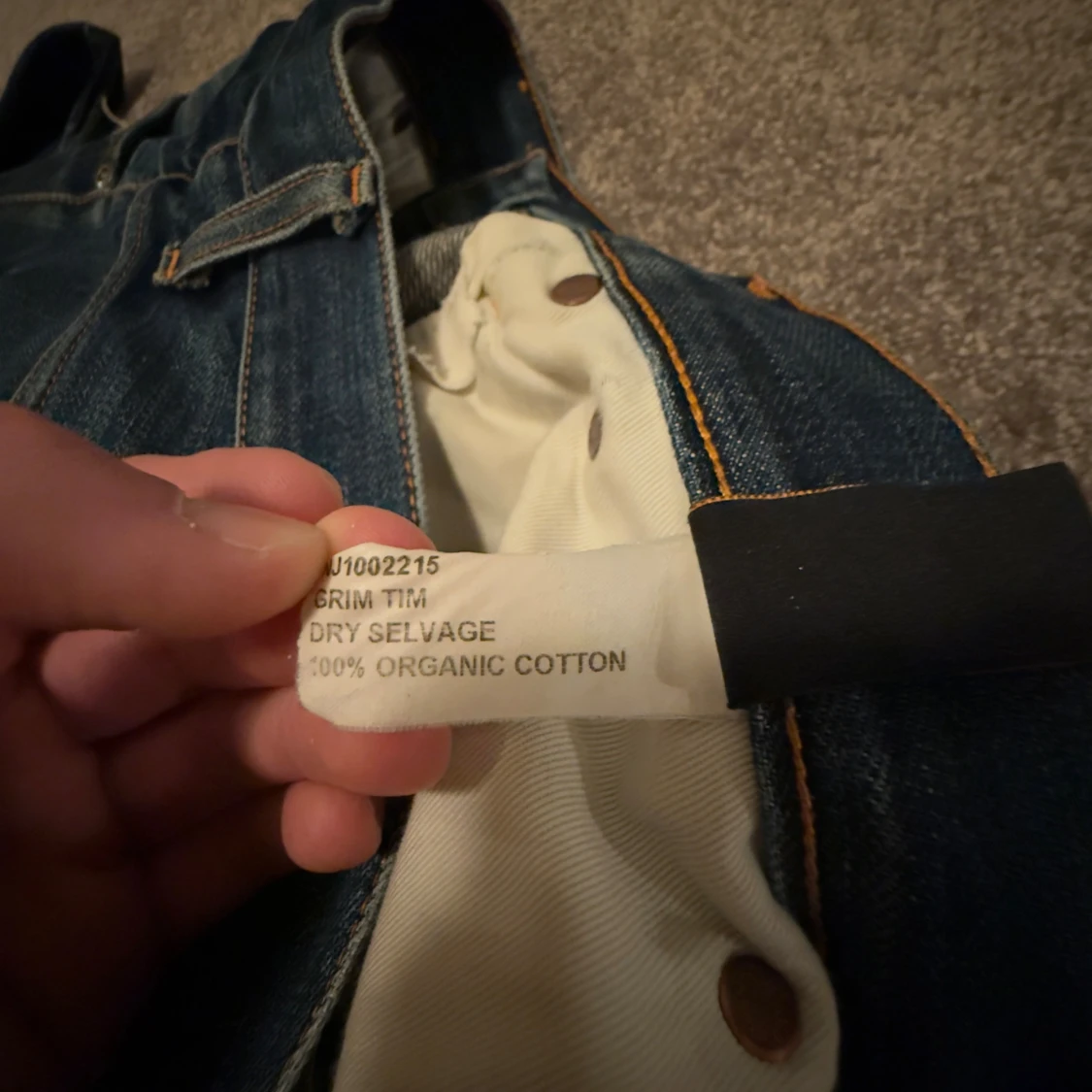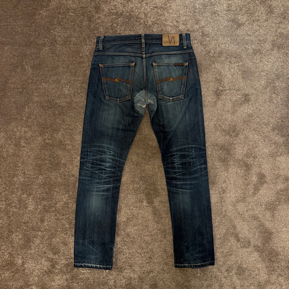 Nudie Jeans Dry Selvage med en riktigt vacker fade❕Lagningen som visas på andra bilden syns knappast när man har på sig dom. Storlek 32:32 | Modell: Grim Tim | Hör av dig vid minsta fråga!