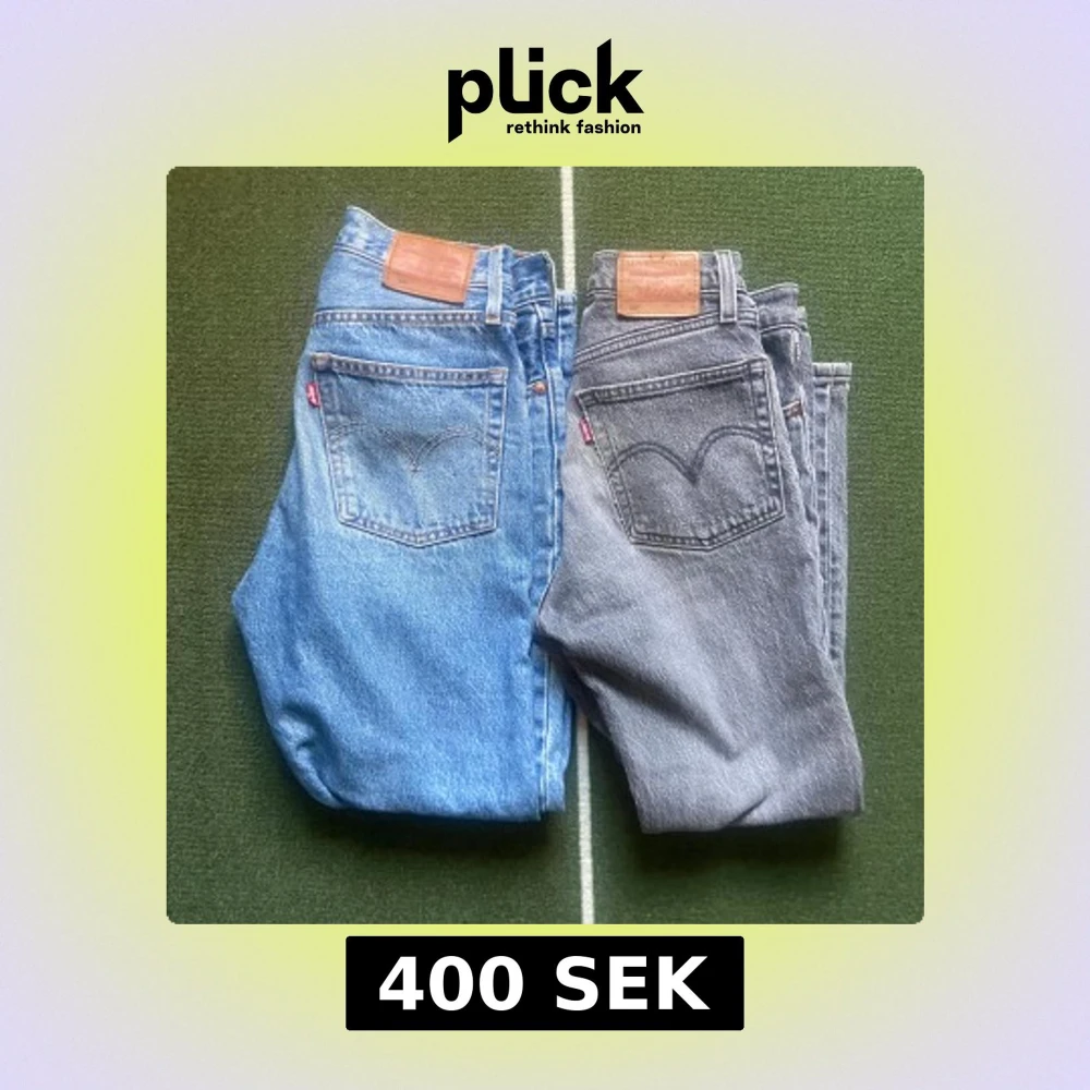 Två par klassiska Levi's 501 jeans, ett i ljusblå denim och ett i grått. Båda har raka ben, fem fickor och den ikoniska läderpatchen bak. Perfekta för dig som gillar tidlös stil och vill ha ett par jeans som funkar till allt. Blå byxan storlek är w 24 L 28 medans svart/grå byxan w 24 och L 26. Går att köpa ena byxan.