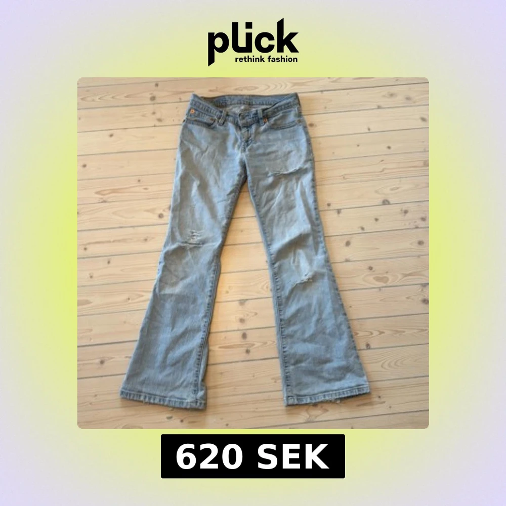Snygga ljusblå bootcut jeans med slitna detaljer. De har en klassisk femficksdesign och knappgylf. Perfekta för en avslappnad stil.