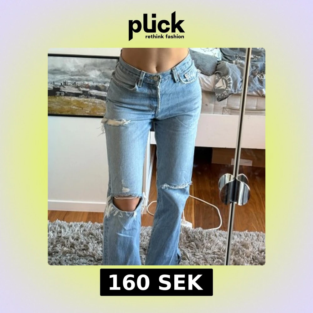 Snygga ljusblå Levis jeans med slitningar på knäna. De har en hög midja som jag brukar vika ned. De är insydda i midjan, mått står på bilderna. Storlek L34 i längd. Kolla gärna in mina andra annonser för samfrakt🥰🫶🏻