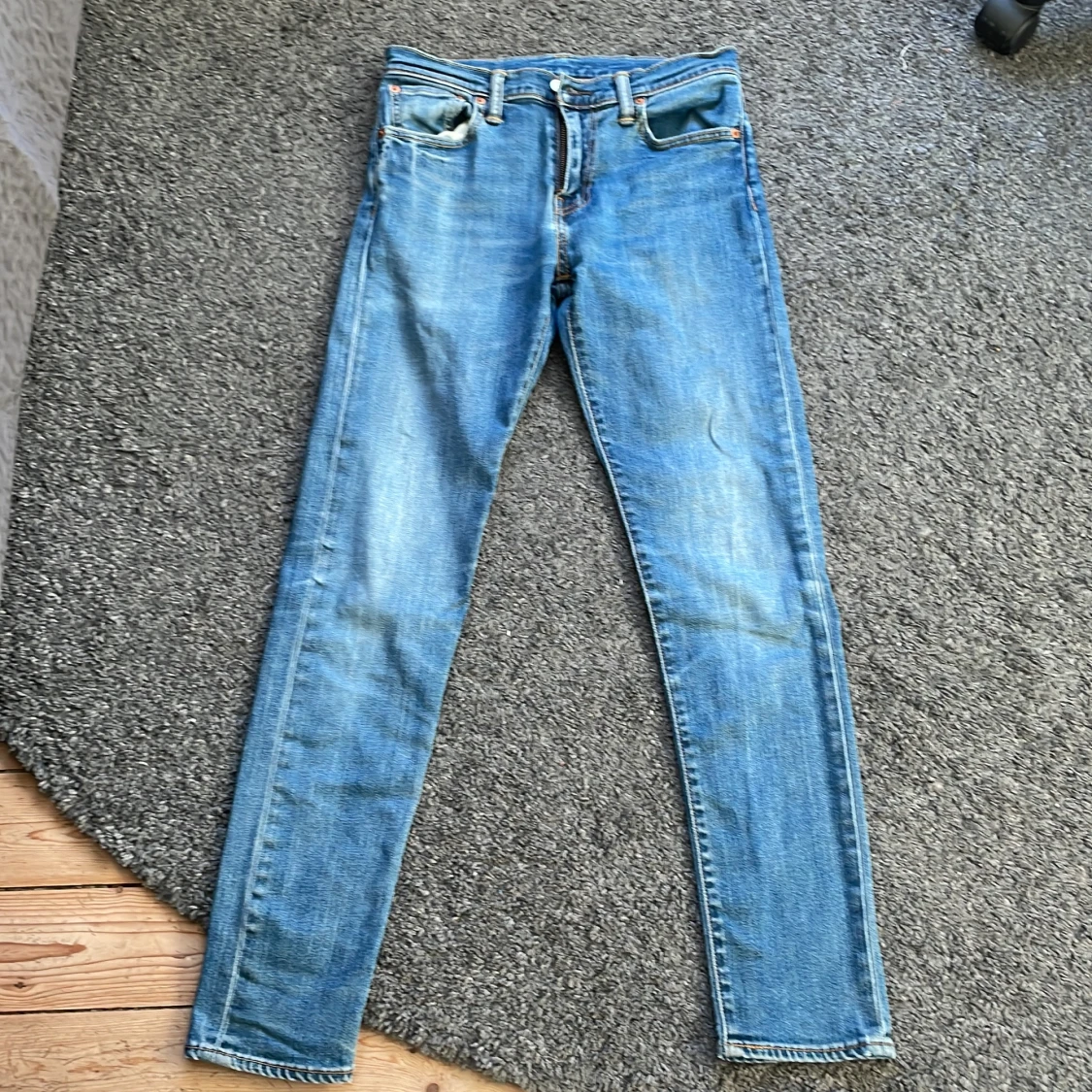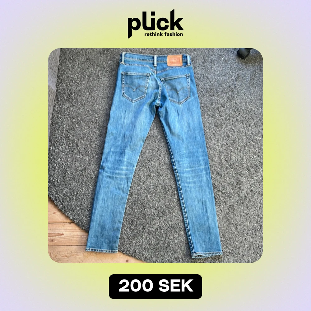 Säljer ett par klassiska blå jeans i bra skick. De har en snygg, något tvättad look och är i en slim passform. Perfekta för vardagsbruk och kan matchas med det mesta i garderoben. Passar både till sneakers och kängor. Levis modell 512 strl w 29 L 32