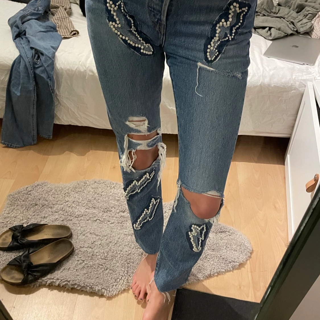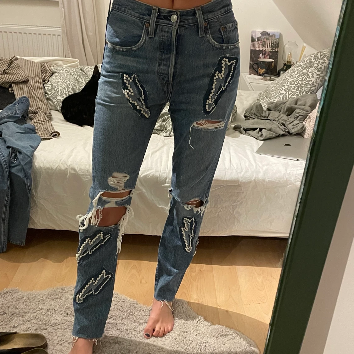 Säljer dessa skitsnygga jeans från levis strl w25l32 i jättefint skick! har sytt på blixtar samt Sandro lapp på rumpan från mina gamla sandro jeans som sprack, därav jag sydde fast allt på dessa jeans istället!