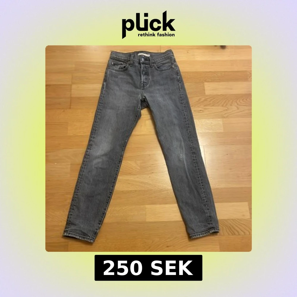 Säljer ett par klassiska Levi's 501 jeans i snygg grå tvätt. Modellen har rak passform, fem fickor och knappgylf. Jeansen är tillverkade i slitstarkt denim och har den ikoniska läderpatchen bak i midjan. Har ett pytte litet hål på vänster knä men har sytt för. Så att det inte syns.146-152 men funkar för större