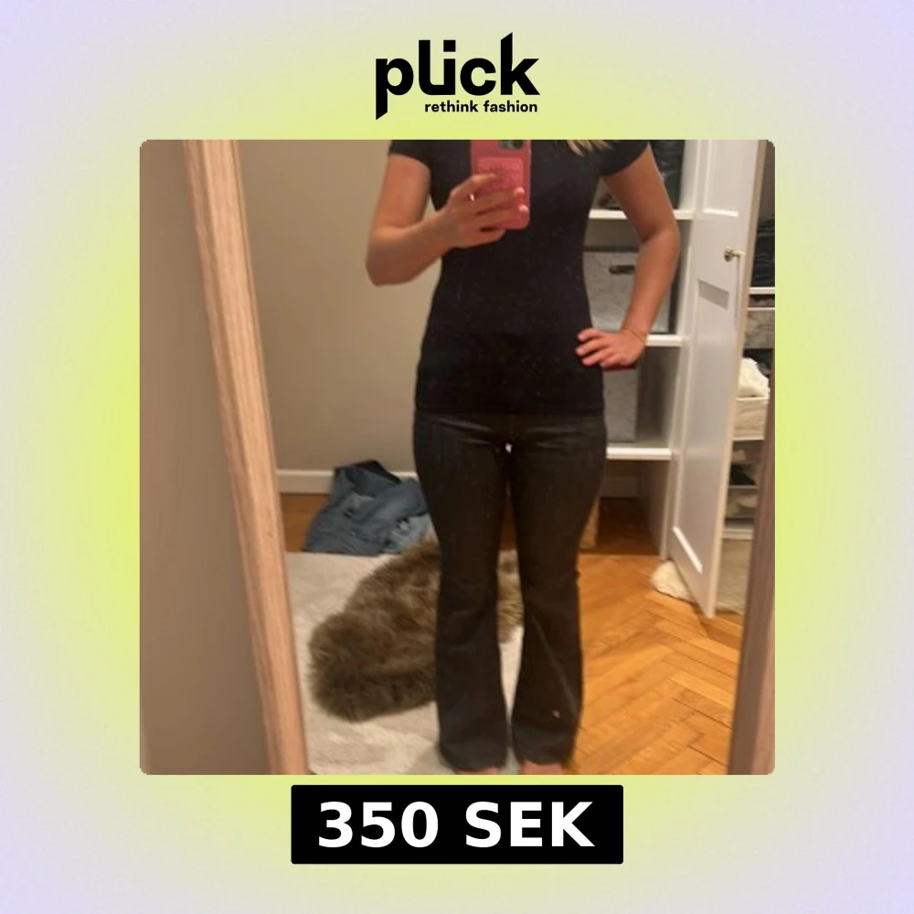 Säljer ett par svarta jeans med bootcut-modell och klassisk femficksdesign. Jeansen har en snygg mörk tvätt och raka ben som blir vidare nedtill. De är midwaist
