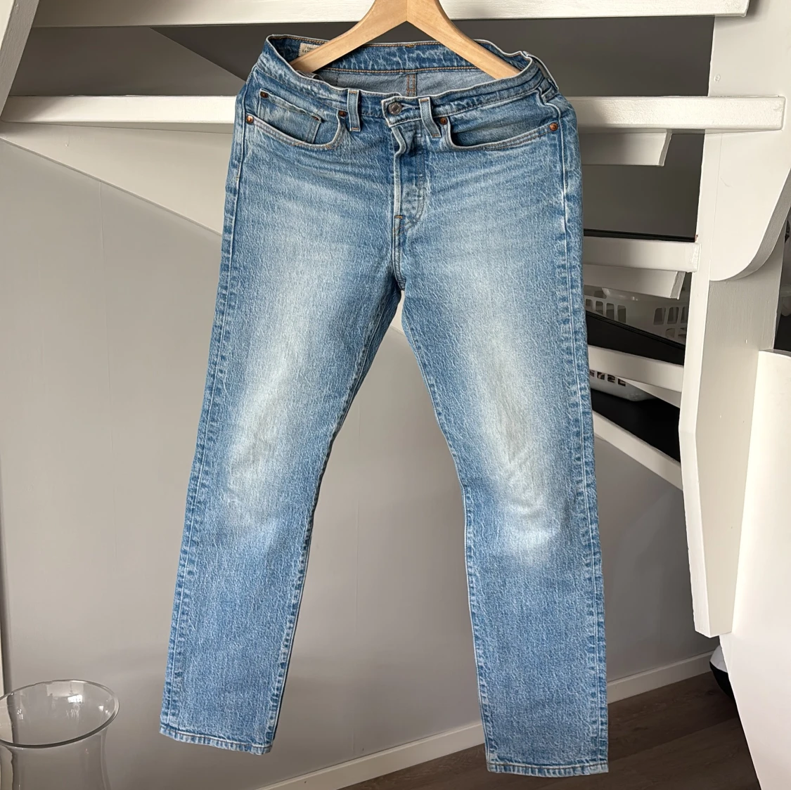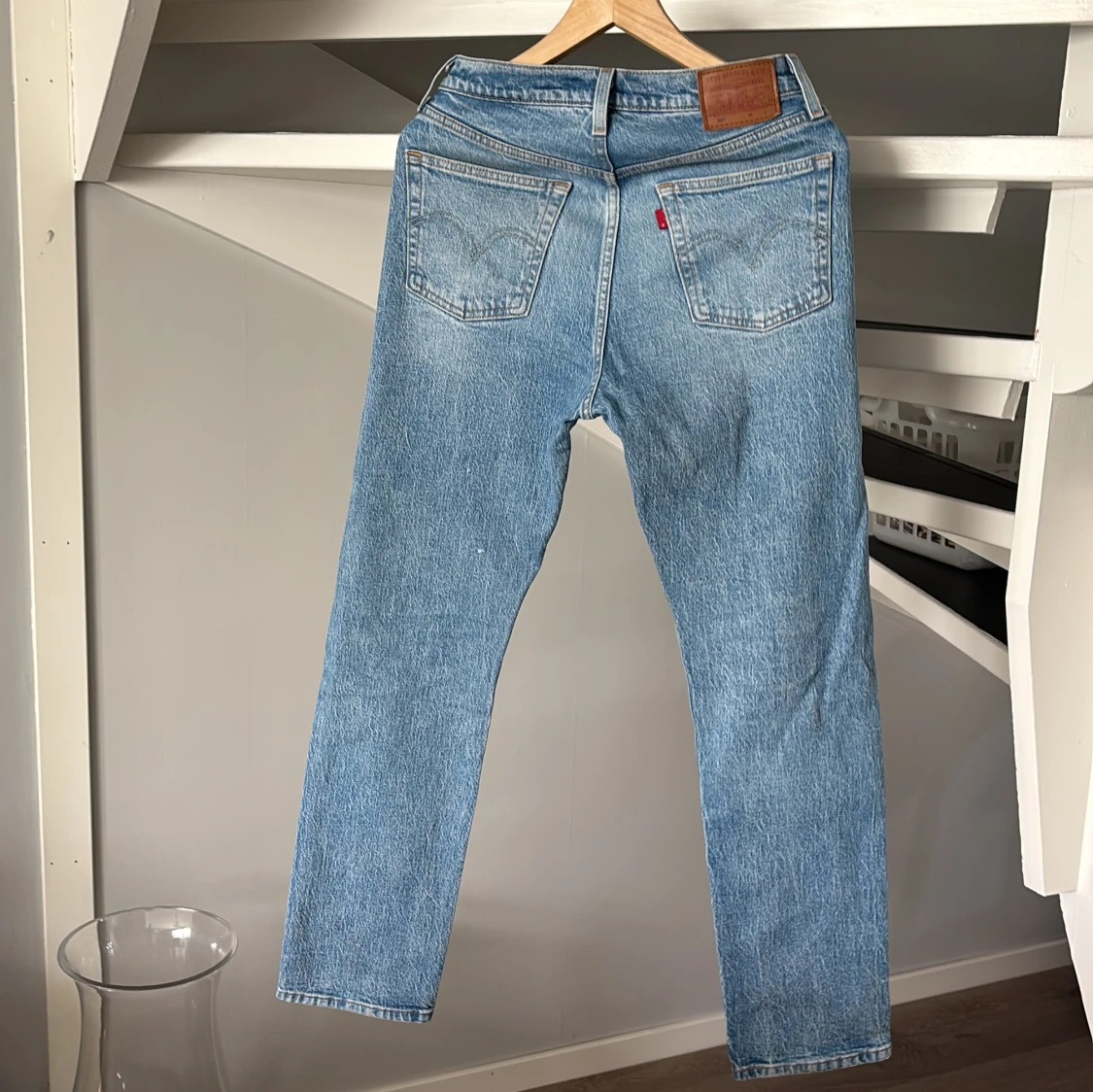 Klassiska Levis 501 jeans i ljusblå. Byxorna har knappgylf och den ikoniska Levis-lappen bak i midjan. Dem är i bra skick så bara att höra av sig om det är något du undrar över