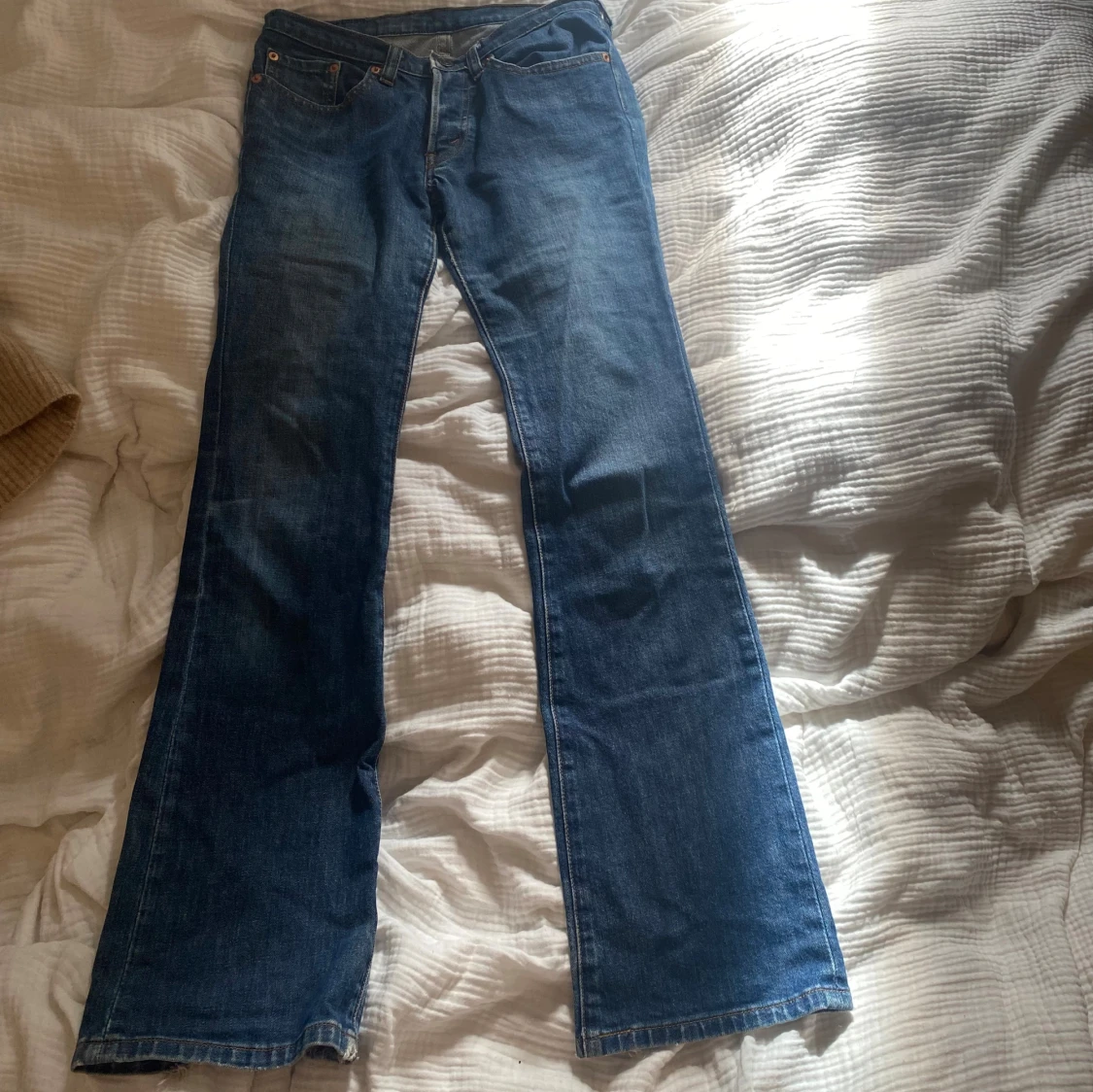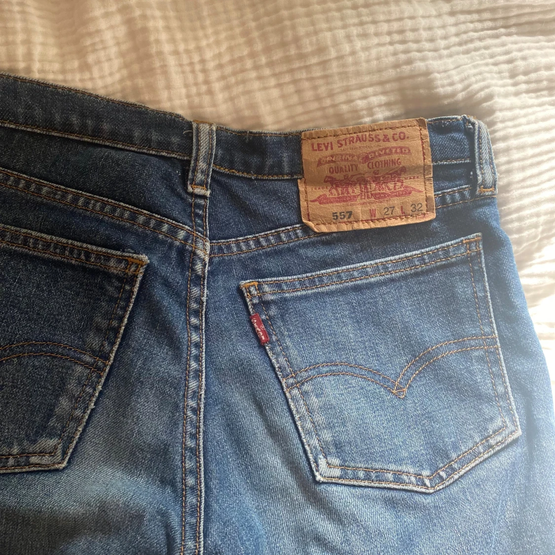Snygga blå Levi's 557 jeans med bootcut passform och klassiska detaljer som fem fickor och orange sömmar. Jeansen har låg midja och är tillverkade i slitstarkt denim. Köpta för ett par år sedan och är nu för små så därför väljer jag att sälja💞💞hoppas nån är intresserad