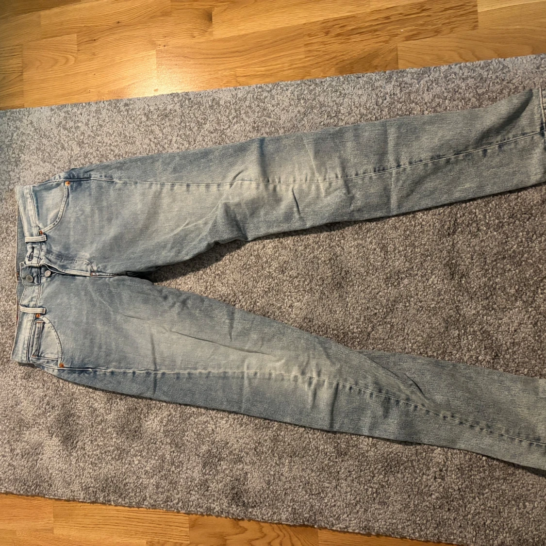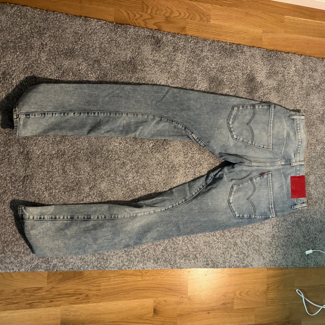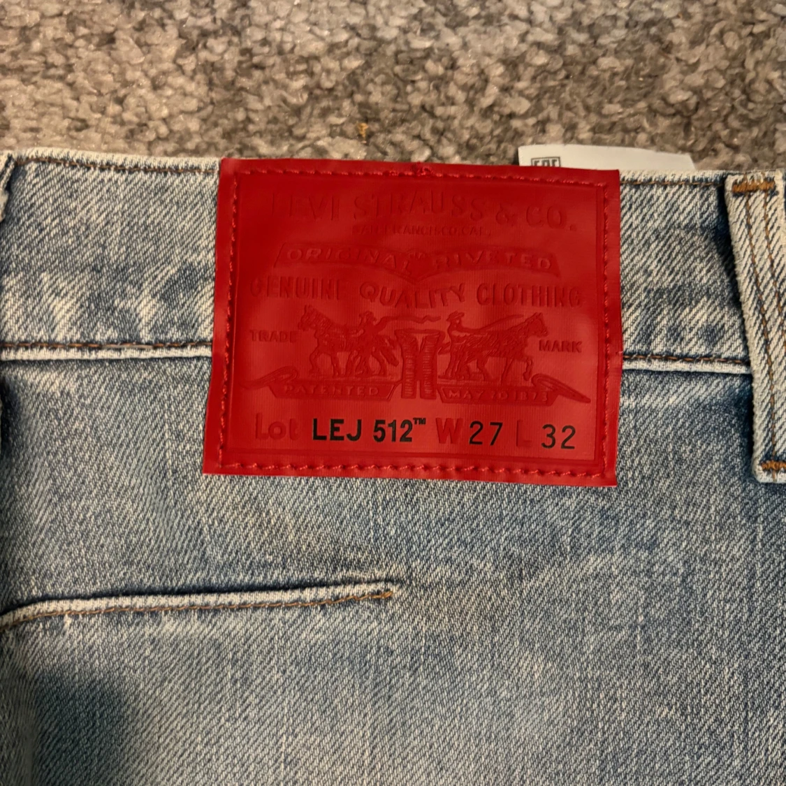 Säljer ett par Levi's 512 jeans i ljusblå tvätt med klassisk femficksdesign och röd patch bak. Jeansen har slim passform med något avsmalnande ben och är tillverkade i mjukt denimtyg. Perfekta för en avslappnad och trendig look.