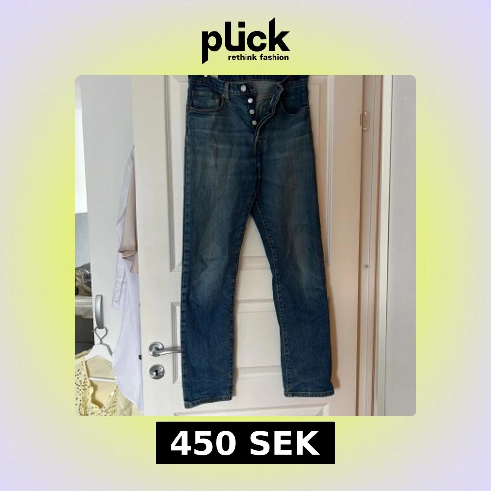 Klassiska Levis 501 jeans i blå denim med knappgylf. De har en rak passform och är tillverkade i slitstarkt jeanstyg. Perfekta för en avslappnad stil.