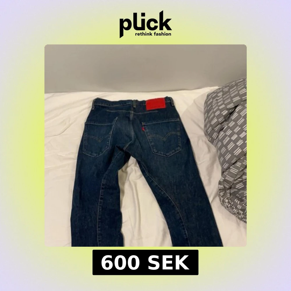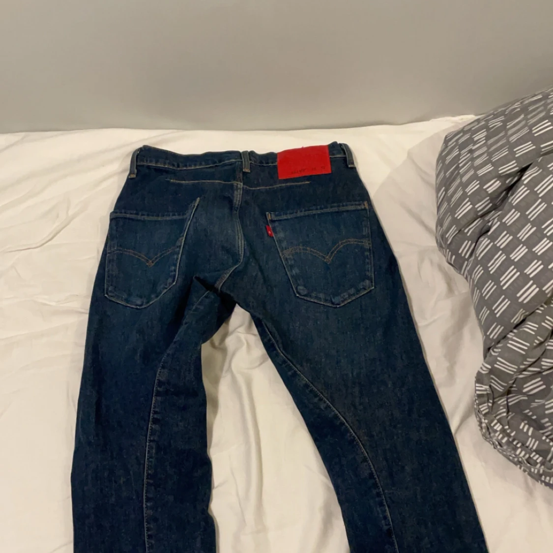 Blå jeansbyxor med röd etikett