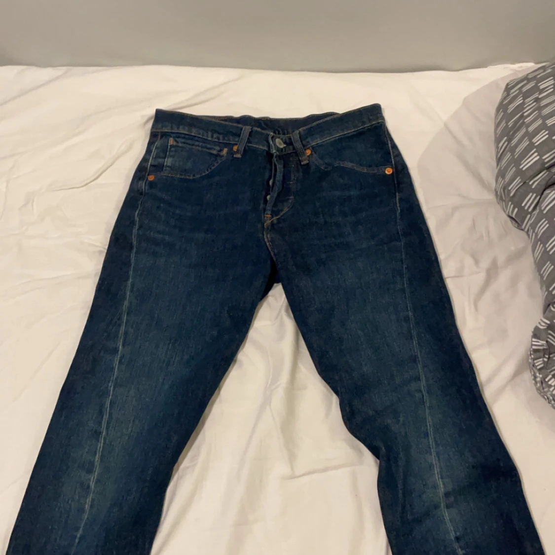 Säljer ett par blå levi’s jeans 512. Byxorna har en normal passform och är utrustade med dragkedja och knappar. Perfekta för en avslappnad stil.
