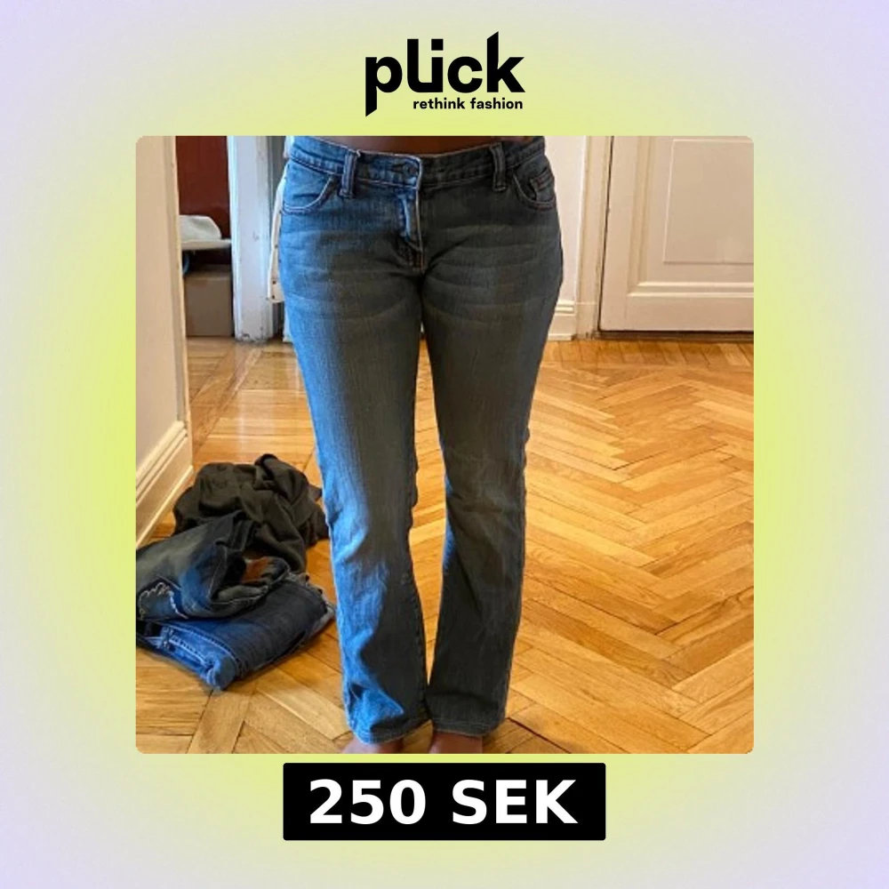 Säljer ett par klassiska jeans i blå tvätt med bootcut passform. Jeansen har fem fickor, röda/rosa sömmar och lägre midja. Materialet är slitstarkt denim i bomull och de har dragkedja och knapp framtill. Perfekt för dig som gillar tidlös stil och sköna jeans.