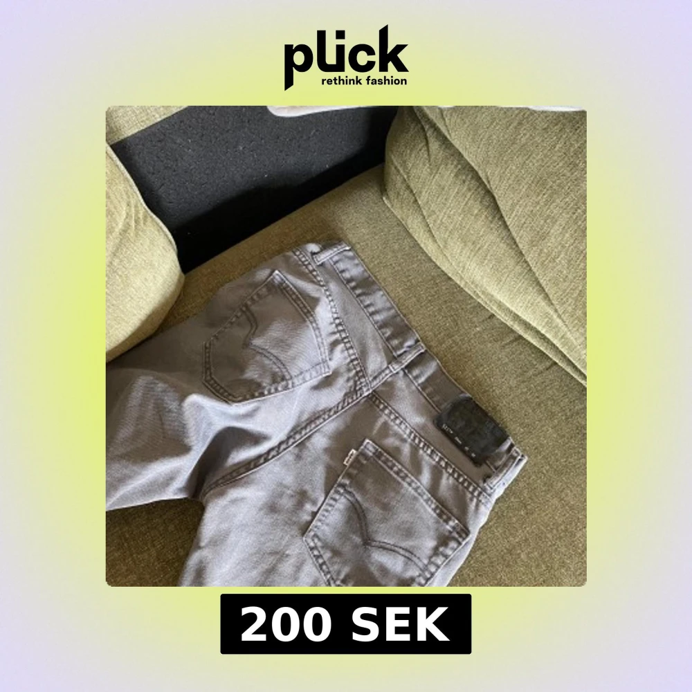 Säljer ett par grå jeansbyxor från Levi's med klassisk femficksdesign och knappgylf. Byxorna har raka ben och normal passform, perfekt för en avslappnad stil. Slim fit 29/30