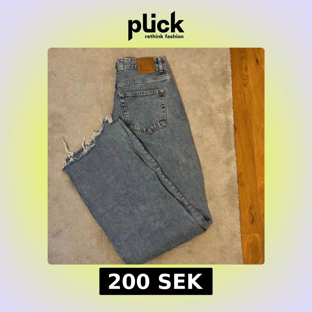 Säljer ett par klassiska jeans i ljusblå tvätt med breda ben och rå, fransig kant nedtill. Modellen har fem fickor, knappgylf och en snygg vintage-vibe. Perfekt för dig som gillar avslappnad och trendig stil.