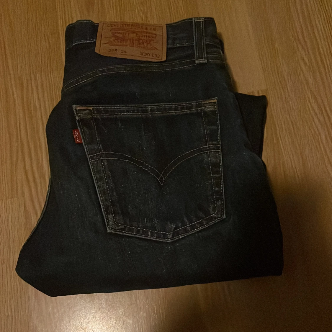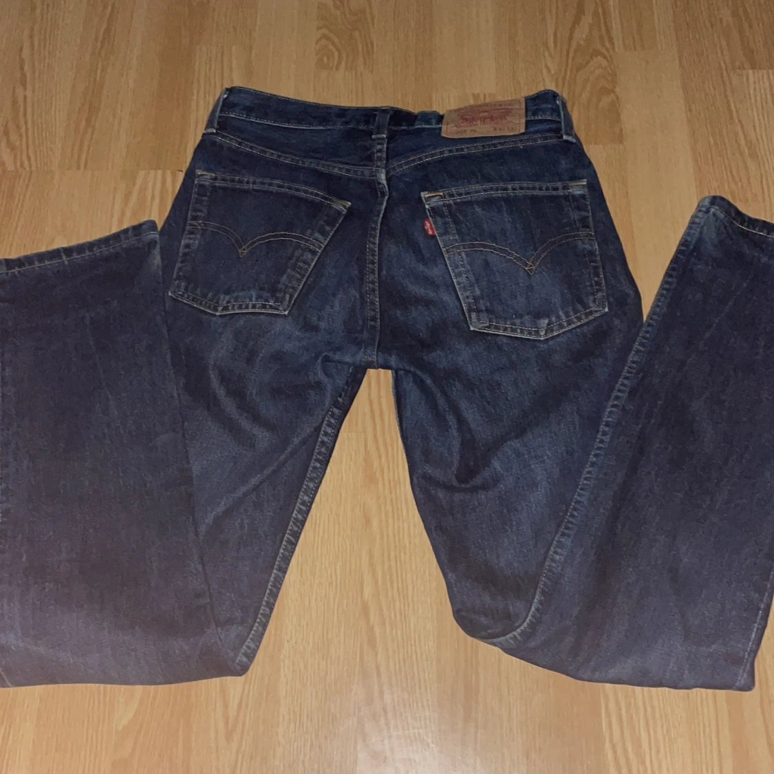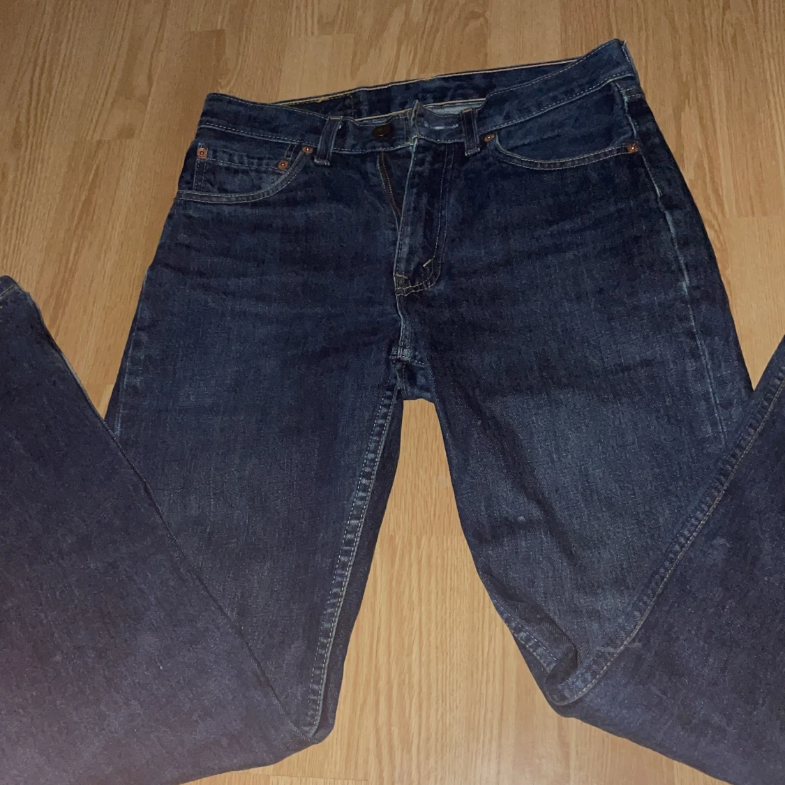 Säljer ett par klassiska mörkblå jeans från Levi's. De har en rak passform och är tillverkade i slitstarkt denim. Perfekta för en avslappnad stil.