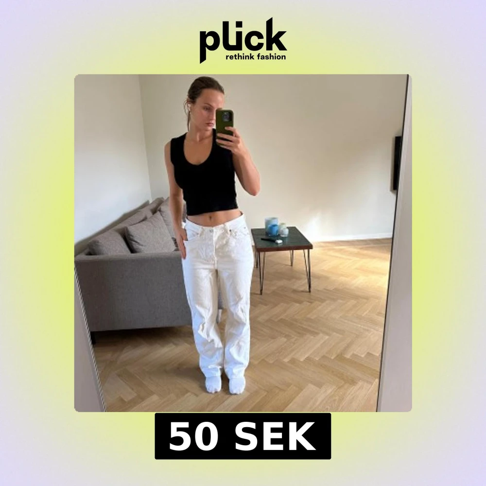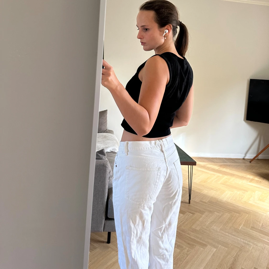 Säljer ett par klassiska vita jeans med rak passform och normal midja. Jeansen har fem fickor, knappgylf och är tillverkade i kraftig bomull. Perfekta för en clean och stilren look året runt. Saknar en knappt och har en liten fläck på ena benet.
