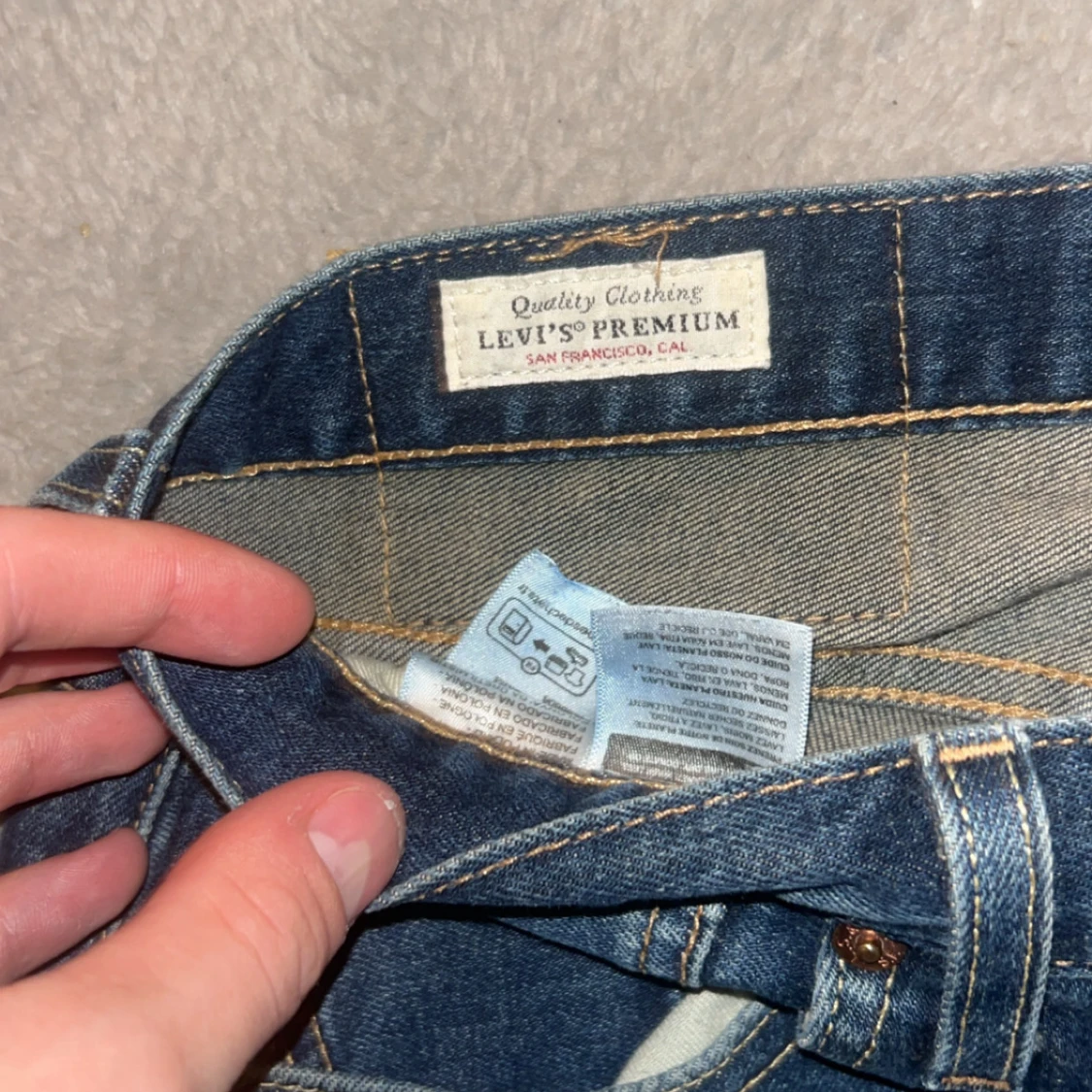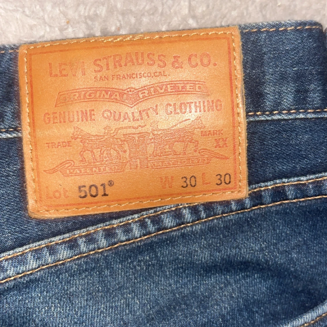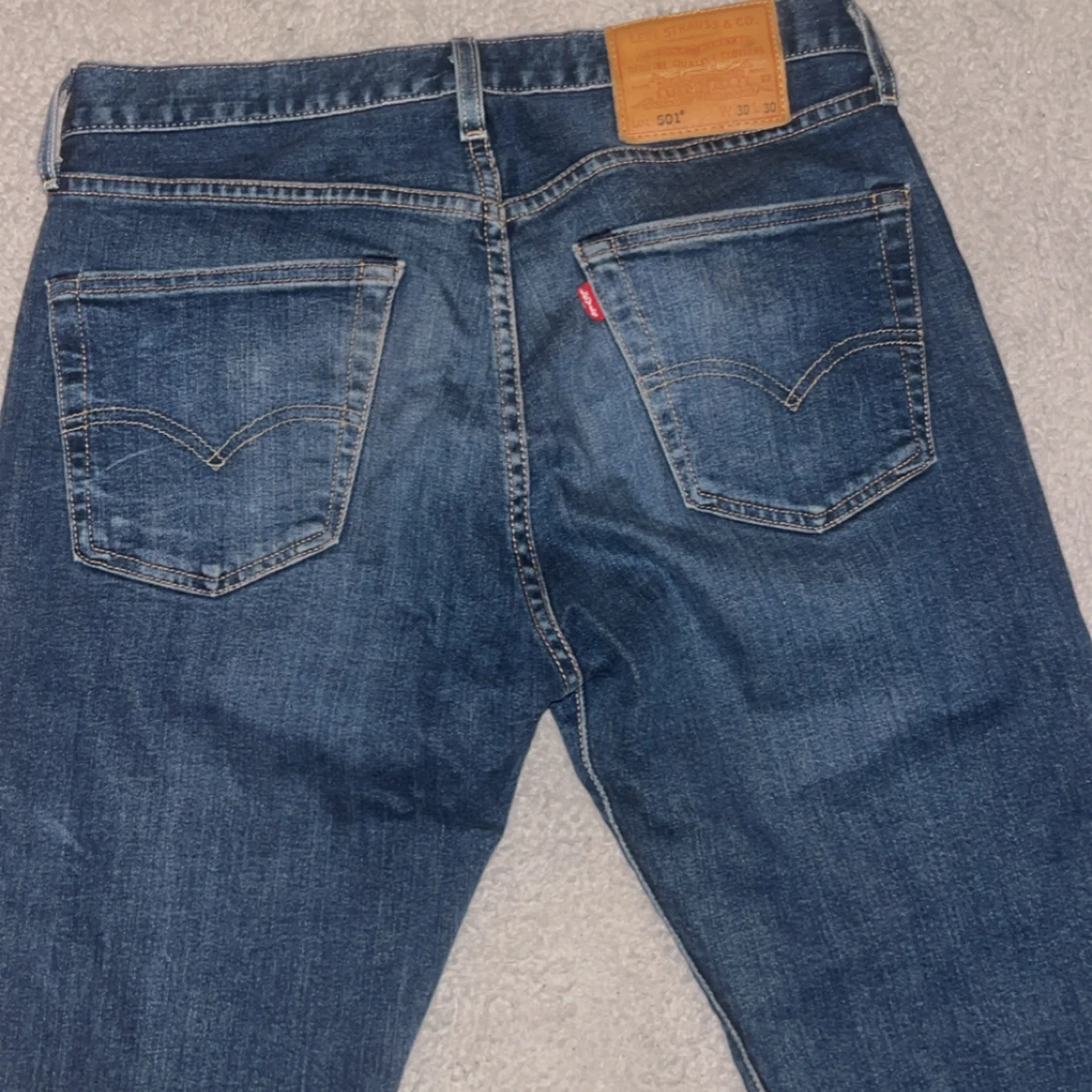 Klassiska Levi's 501 jeans i blå denim med raka ben och normal passform. Byxorna har fem fickor, knappgylf och snygga kontrastsömmar. Märket syns tydligt på bakfickan och läderpatchen i midjan. Perfekta för en avslappnad och tidlös look.