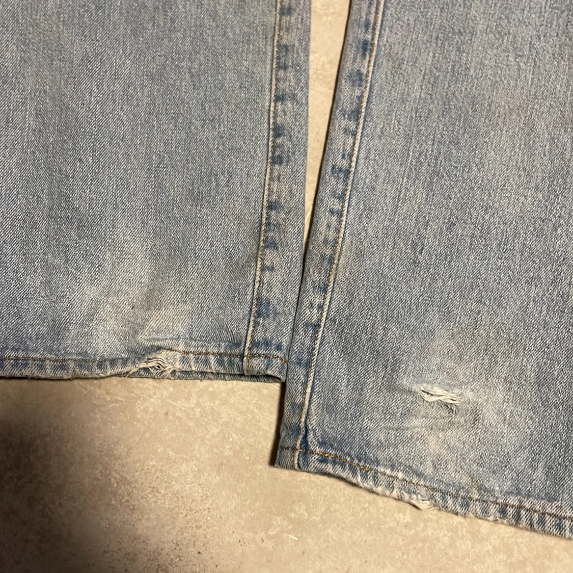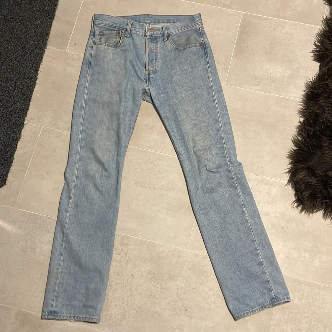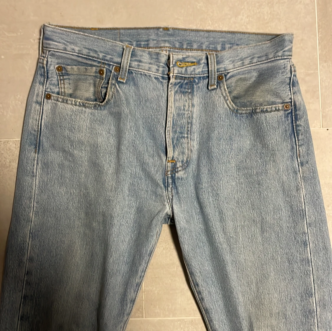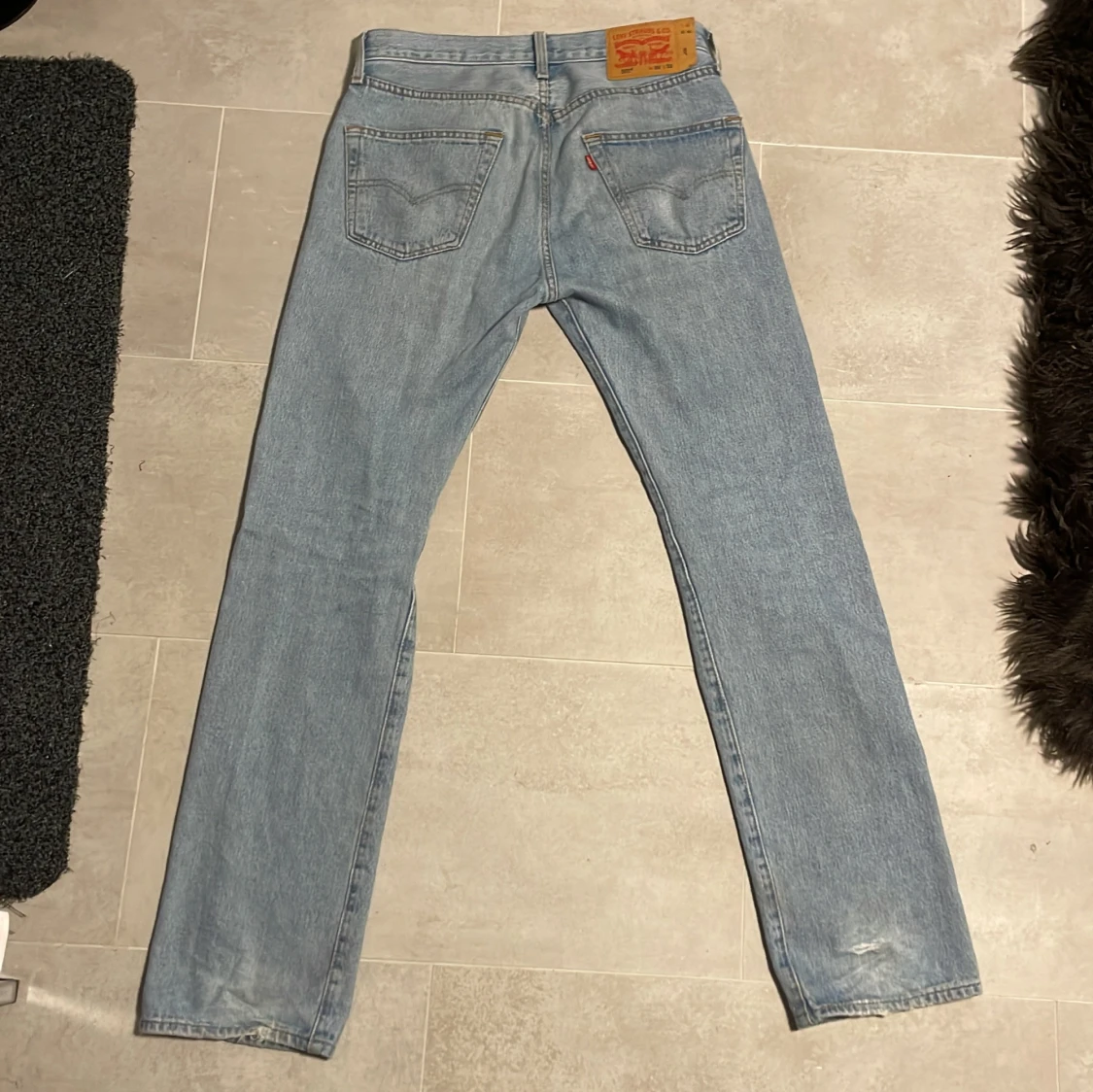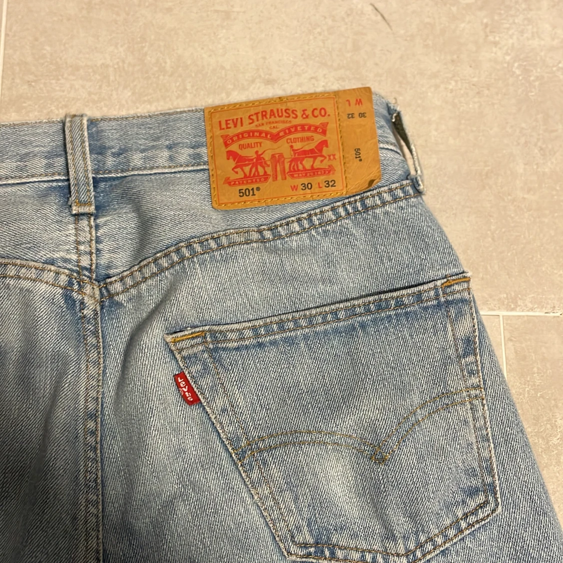 Klassiska Levi's 501 jeans i ljusblå tvätt. Tillverkade i slitstarkt bomullsjeans, Liten slitna på bakbenen längst ner syns på bild 4. Hör av dig vid frågor eller mer bilder!!!